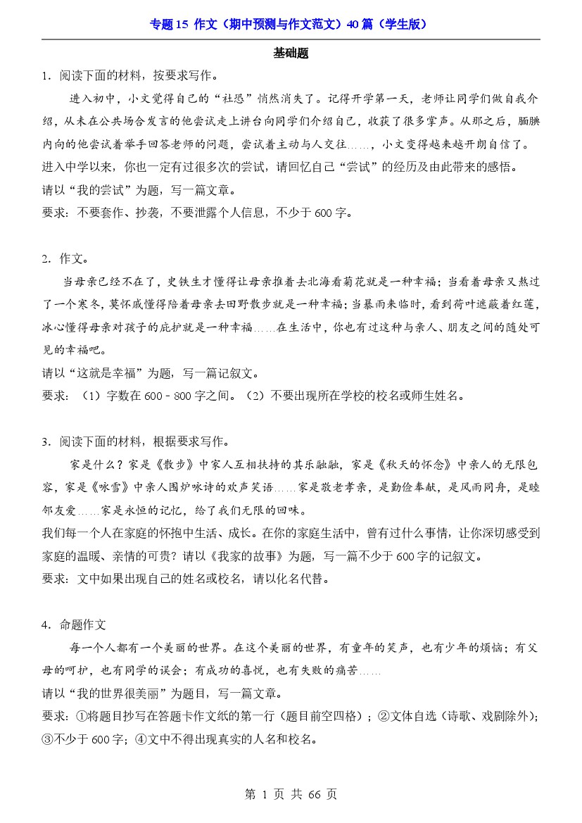 25年秋七上语文期中专项训练专题15 作文40篇(含范文)