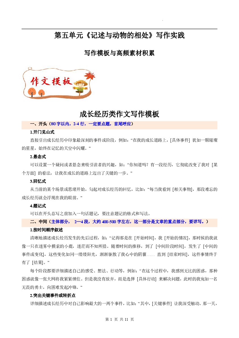 【作文】七年级上册语文专题18 成长经历类作文写作模板+高频素材积累-【同步作文课】