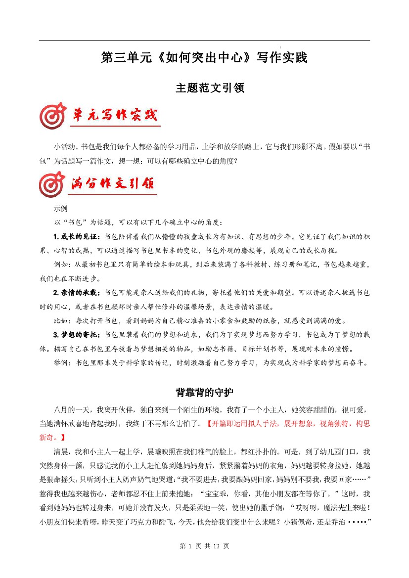 【作文】七年级上册语文专题13:如何突出中心(课文回顾+要点技巧+课内写作范文)