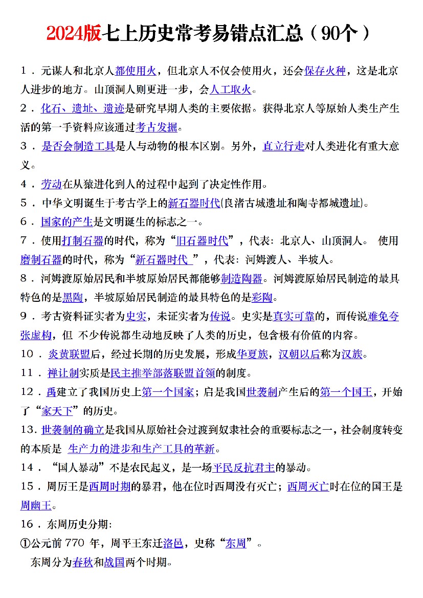 2024新版七年级上册历史考点清单 - 填空版