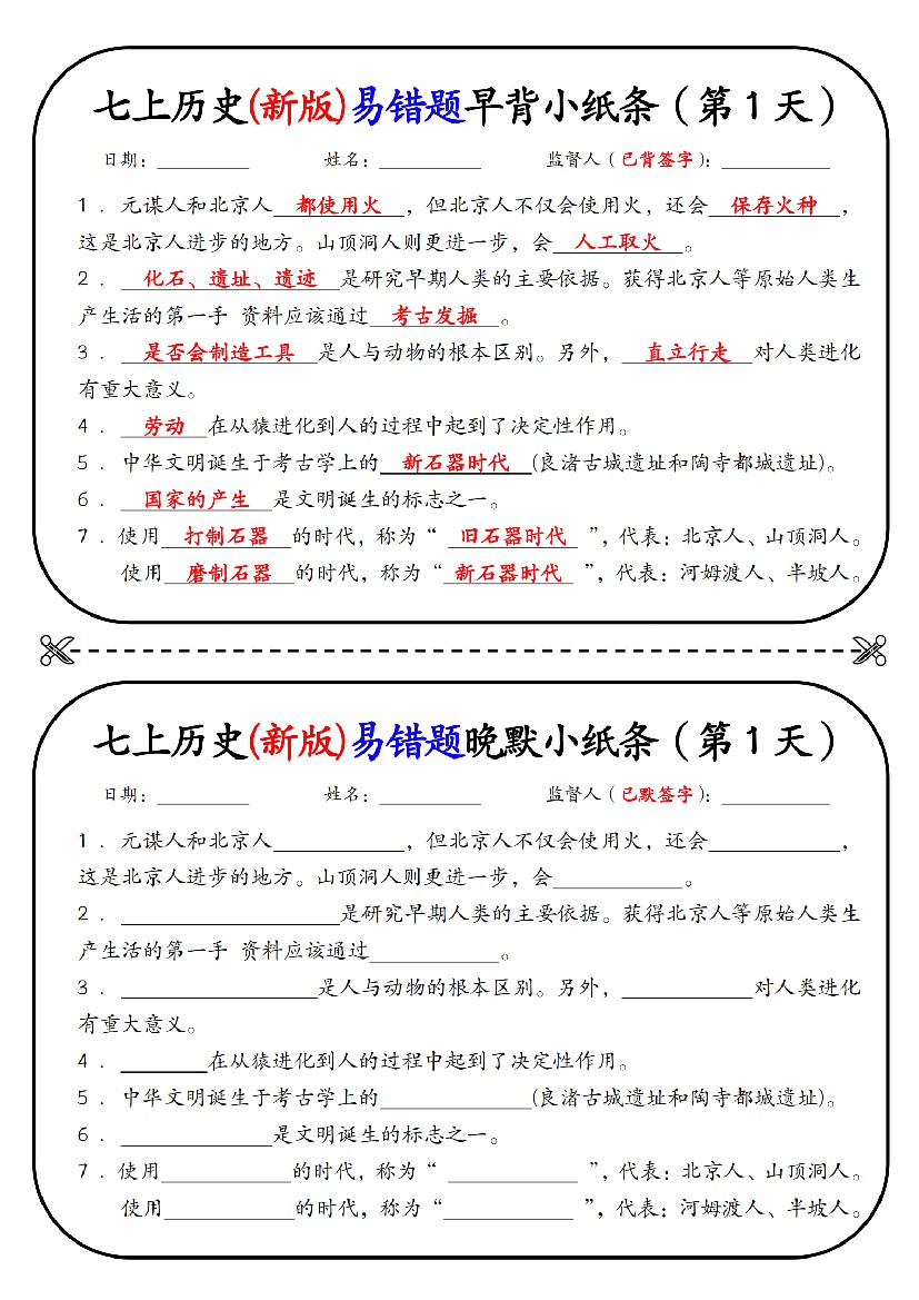 七上历史(新版)易错点早背晚默小纸条(暑假提前练习)
