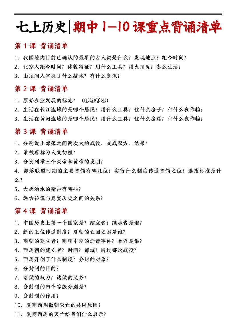 (暑假提前预习)新七上历史期中1-10课重点背诵清单