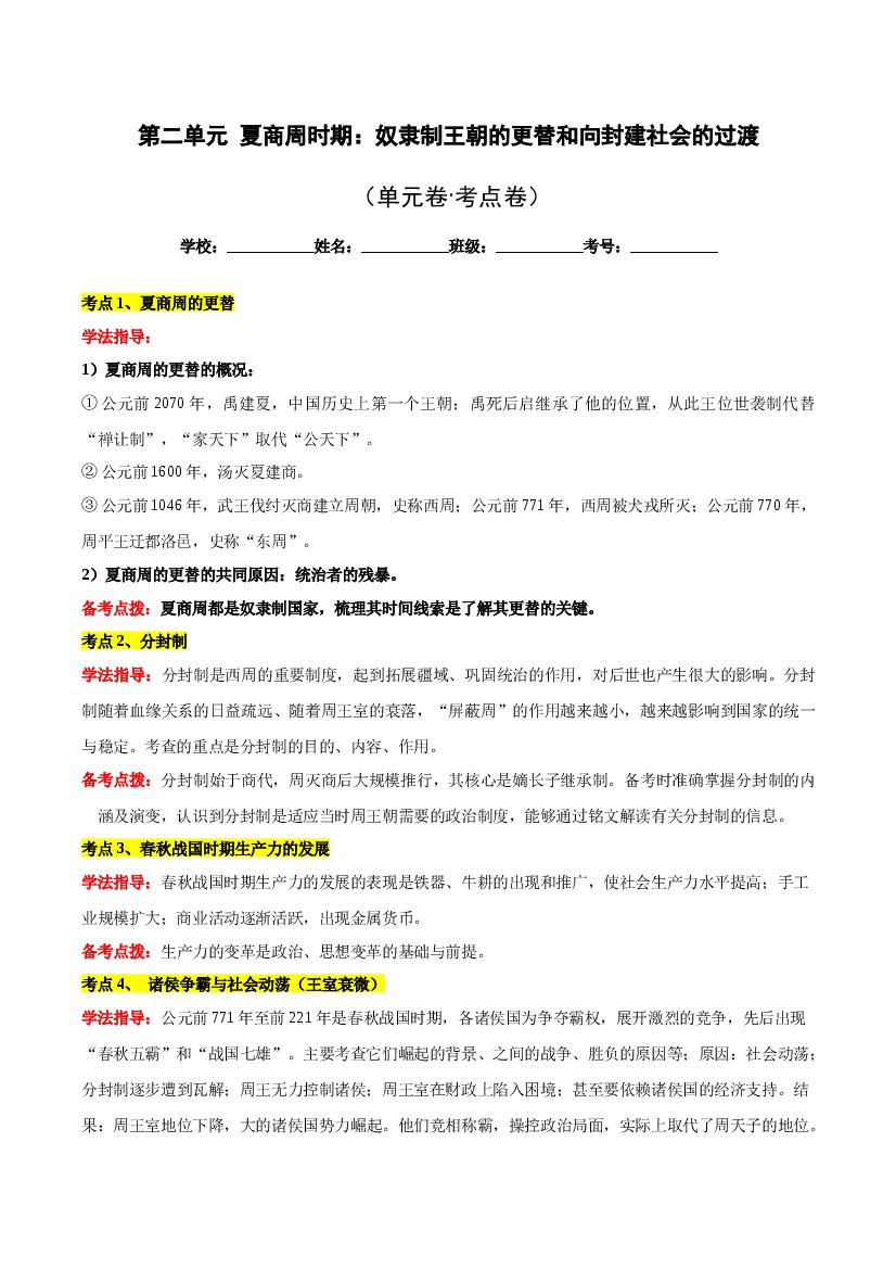 25年秋七上历史第二单元 夏商周时期:奴隶制王朝的更替和向封建社会的过渡【单元卷·考点卷】(解析版)