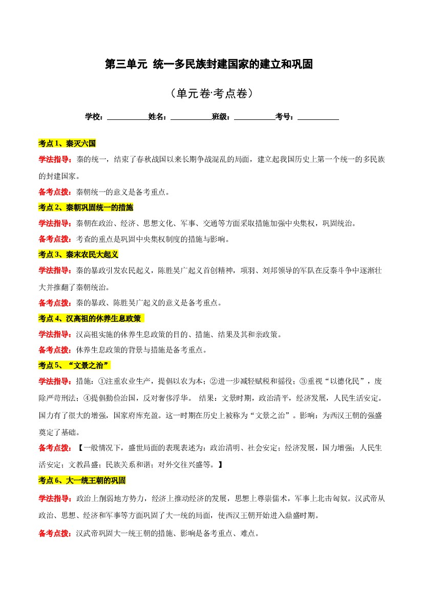 25年秋七上历史第三单元 统一多民族封建国家的建立和巩固【单元卷·考点卷】(原卷版)