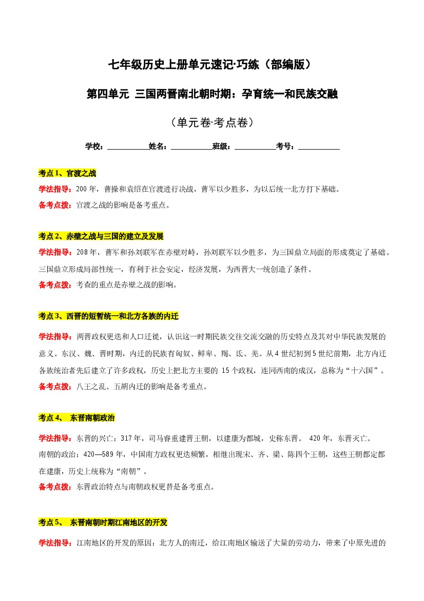25年秋七上历史第四单元 三国两晋南北朝时期:孕育统一和民族交融【单元卷·考点卷】(解析版)