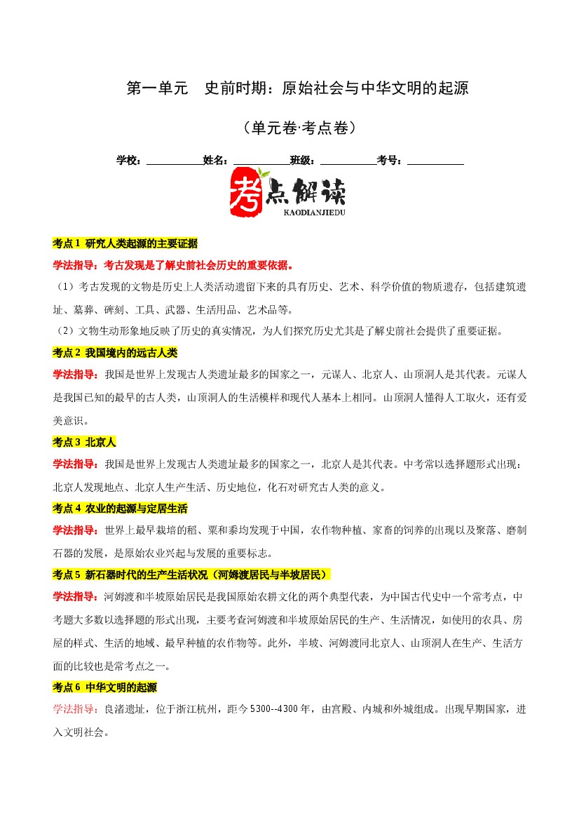 25年秋七上历史第一单元 史前时期:原始社会与中华文明的起源【单元卷·考点卷】(解析版)