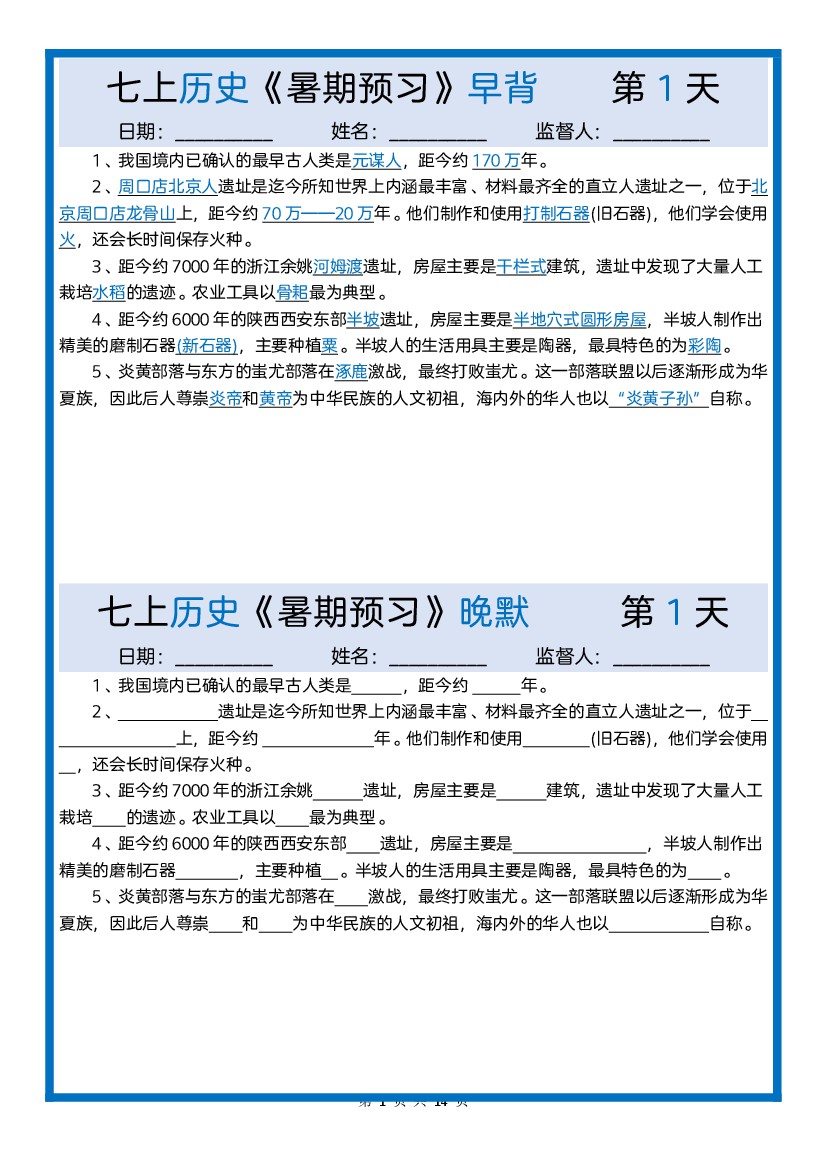 七上历史《暑假预习》早背晚默14天(暑假提前练习)