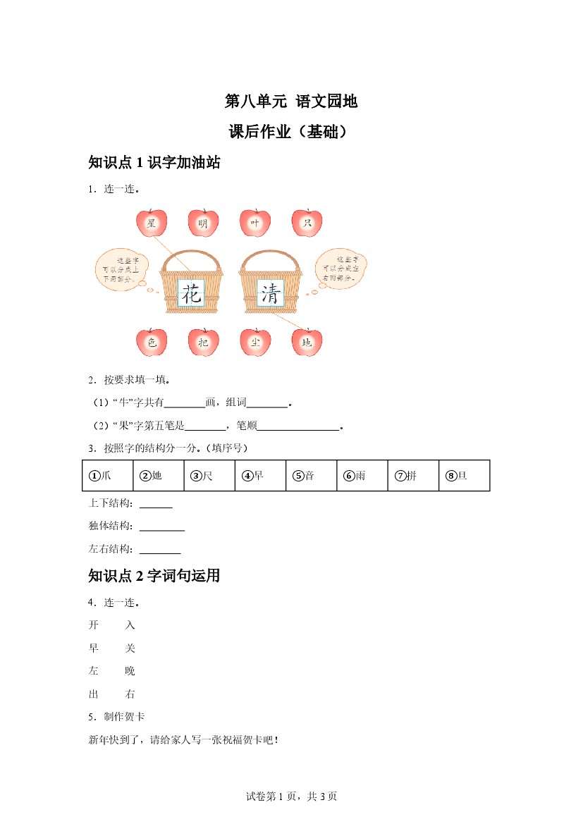 25新一年级上册语文第三单元 语文园地课后作业(基础)