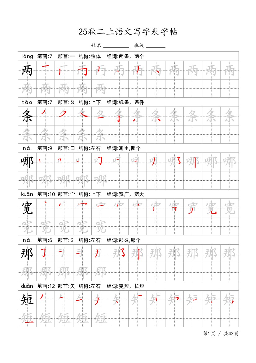 【25秋新二上语文生字表生字拼音描红字帖(251字28页)