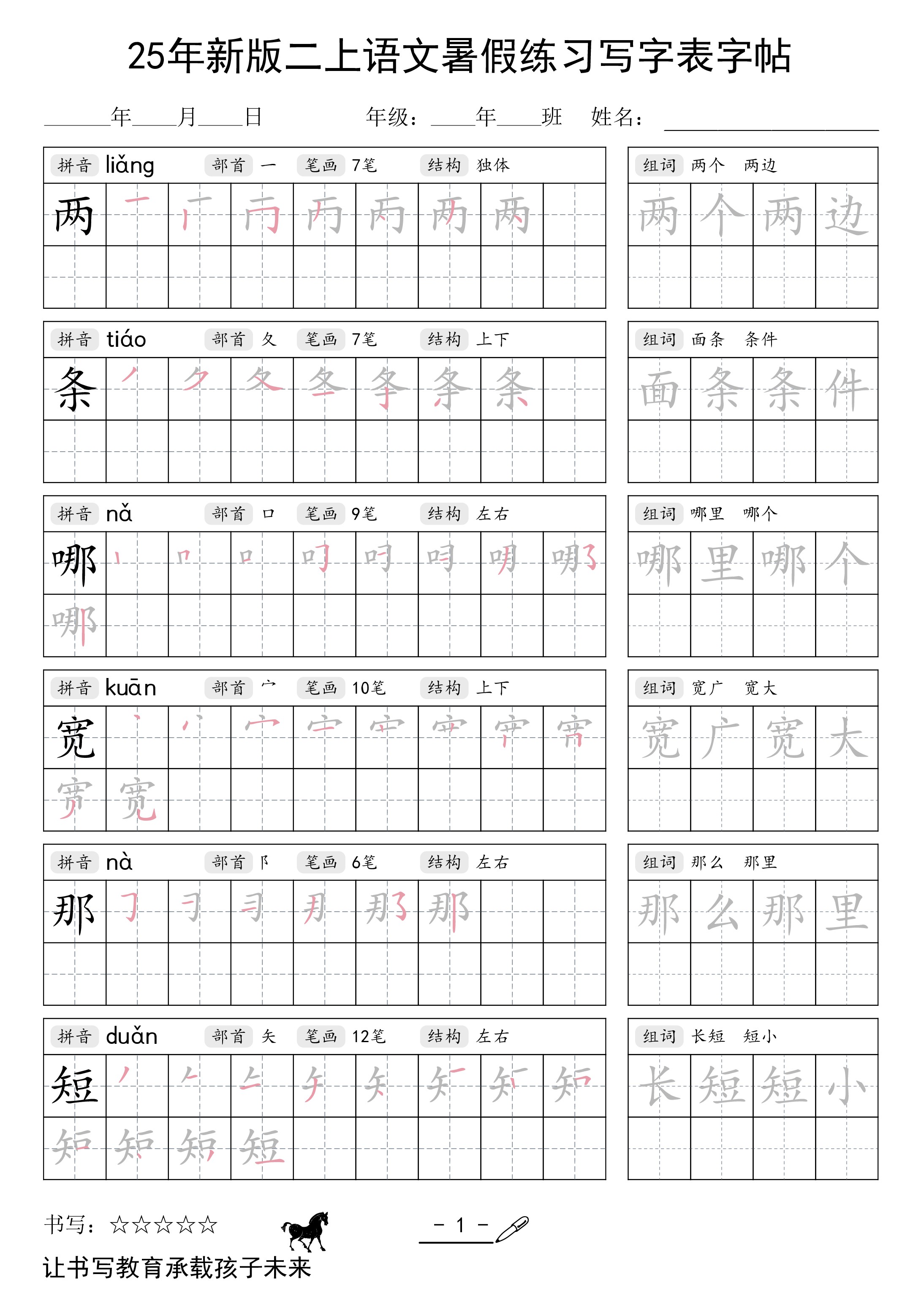 25秋新二年级上册语文二上语文写字表字帖(不带笔顺)