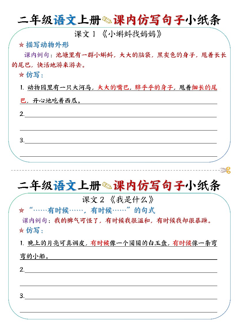 二上课内仿写句子小纸条27条14页