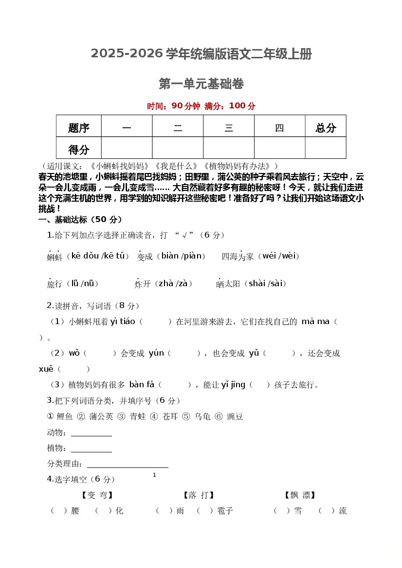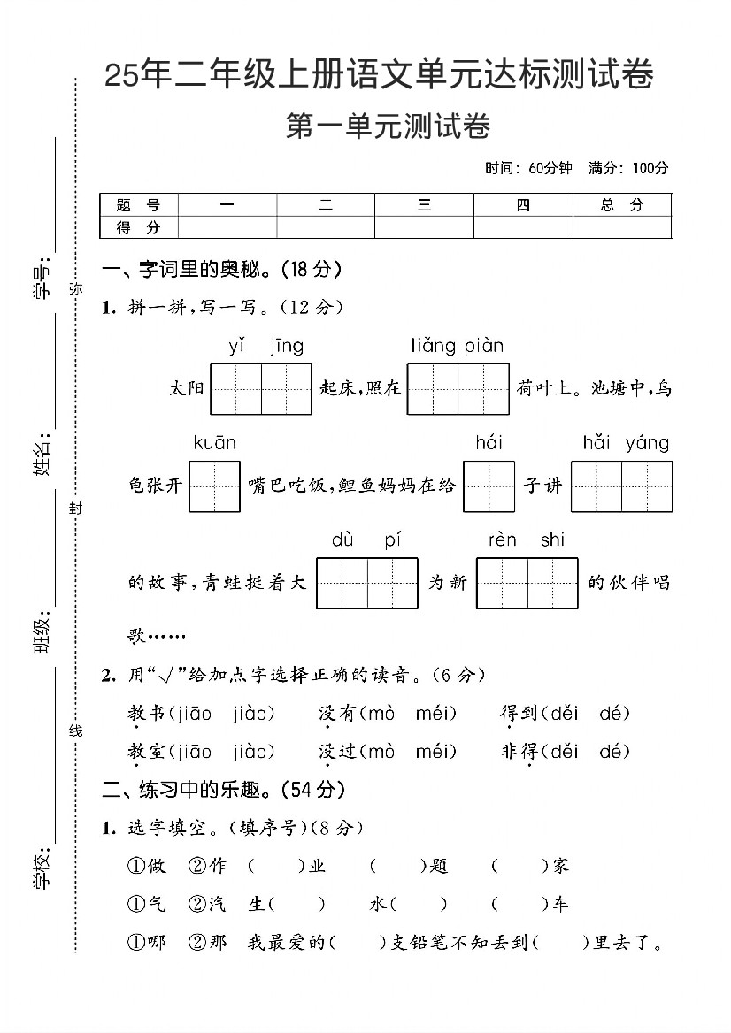 25年新版二上语文第一单元测试卷