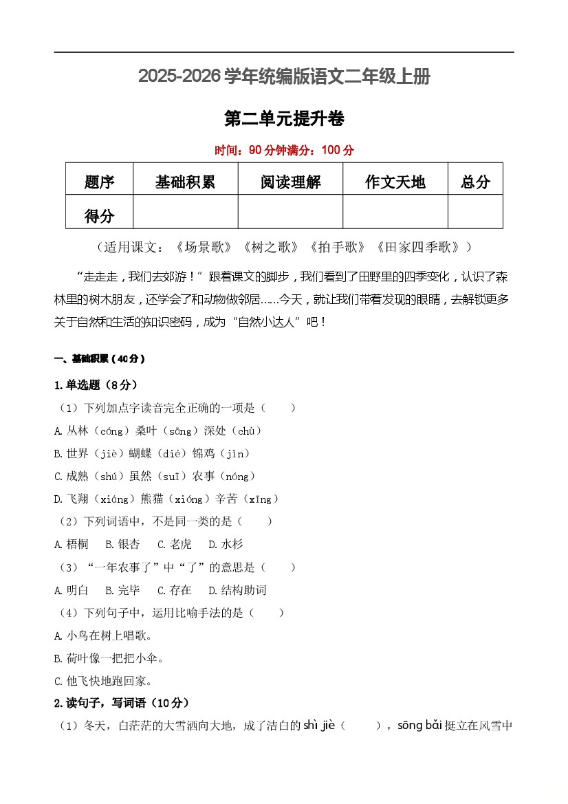 25年新版二上语文第一单元测试卷2