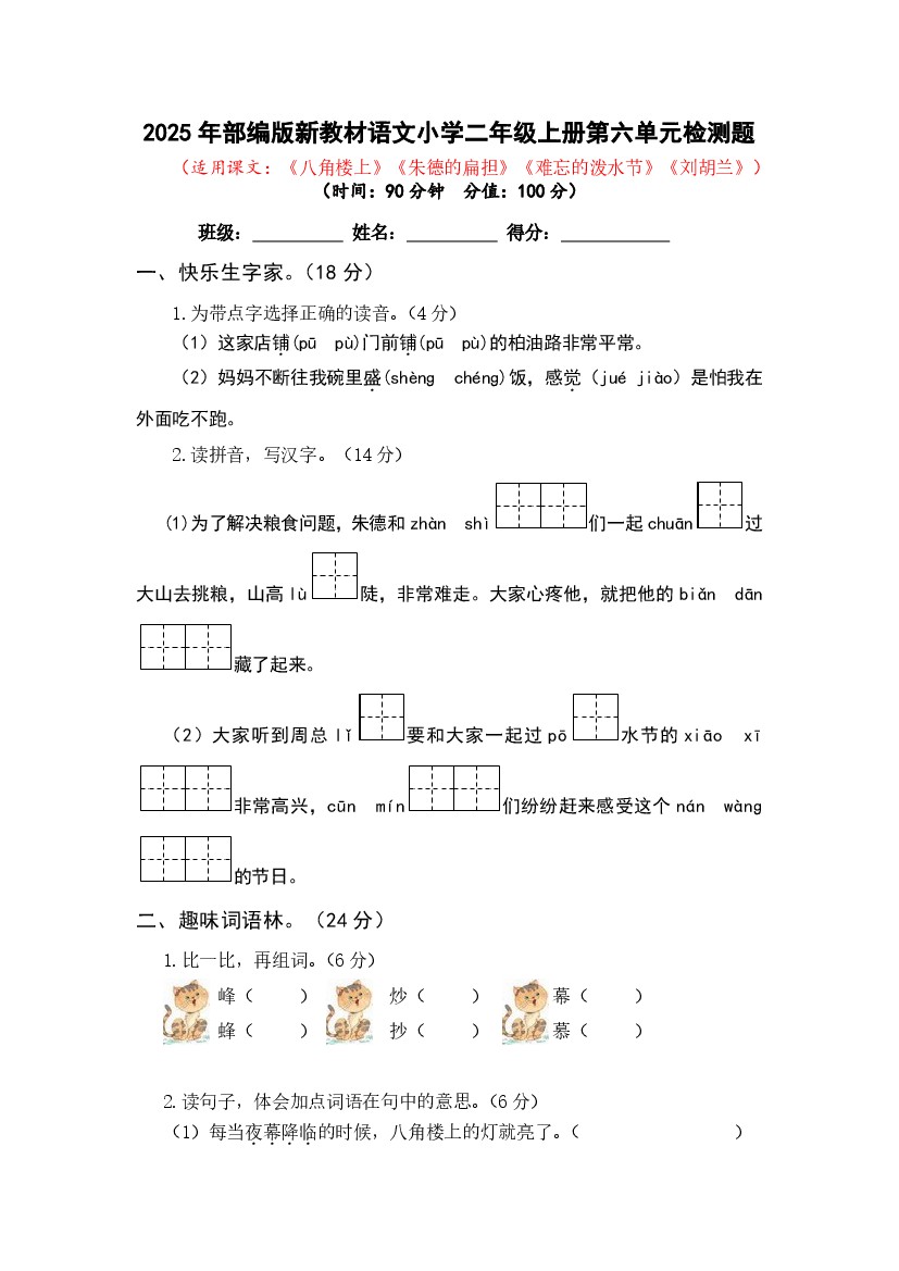 25年语文小学二年级上册第六单元检测题(含答案)
