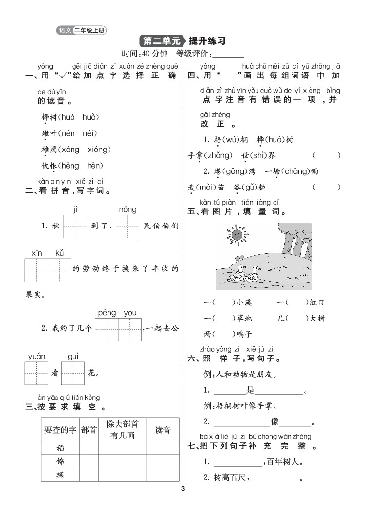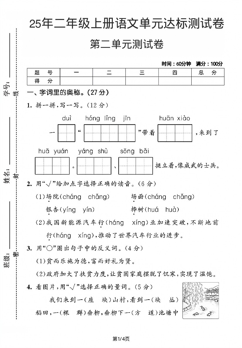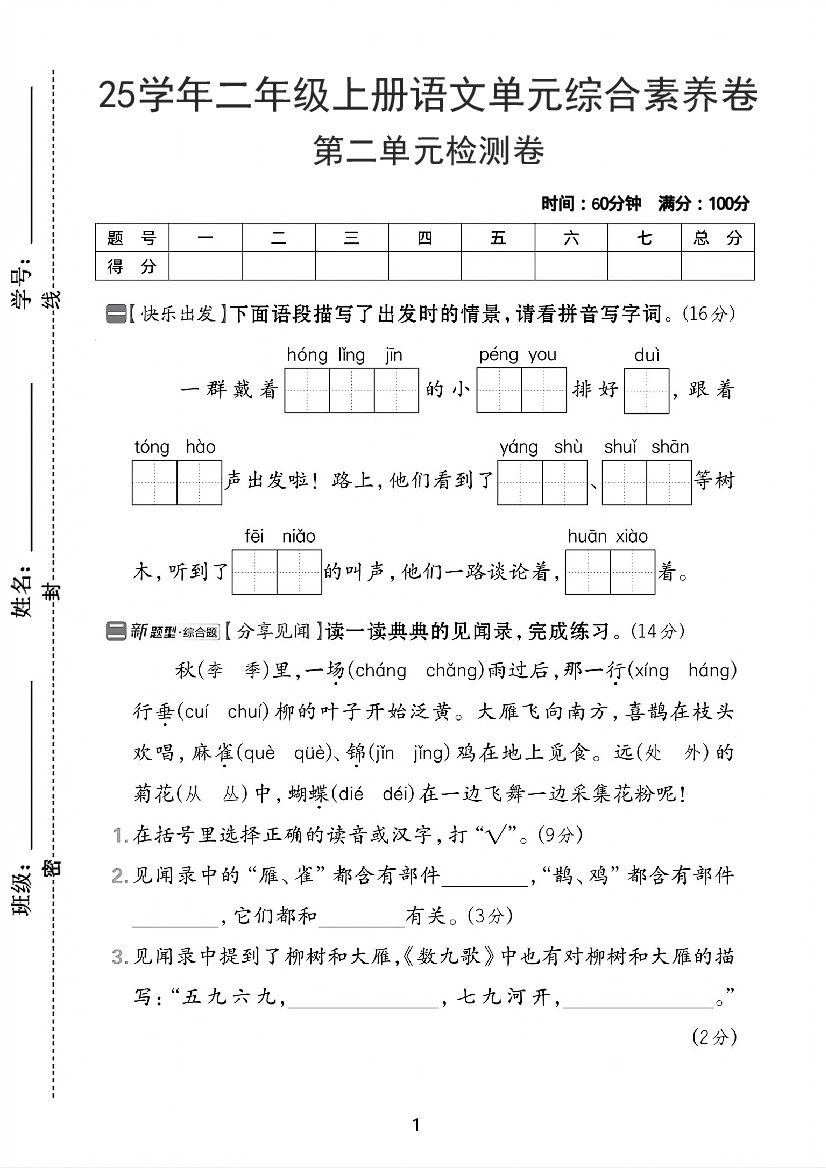 25年二年级上册语文第二单元达标测试卷-一队