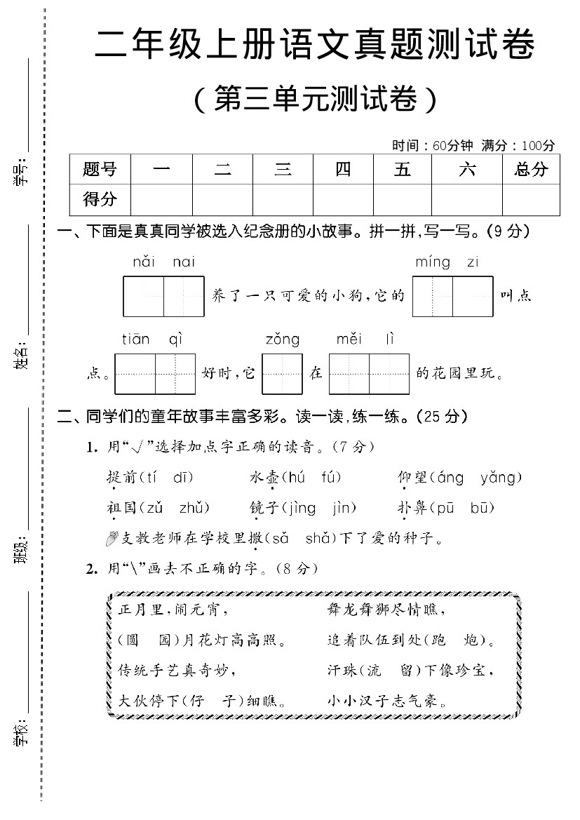 二年级(上)语文第三单元测试卷-奶奶