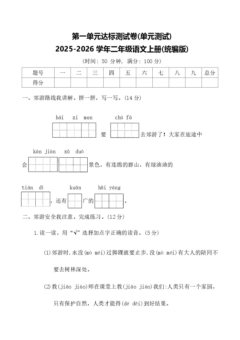 第一单元达标测试卷(单元测试)-2025-2026学年语文二年级上册(统编版)