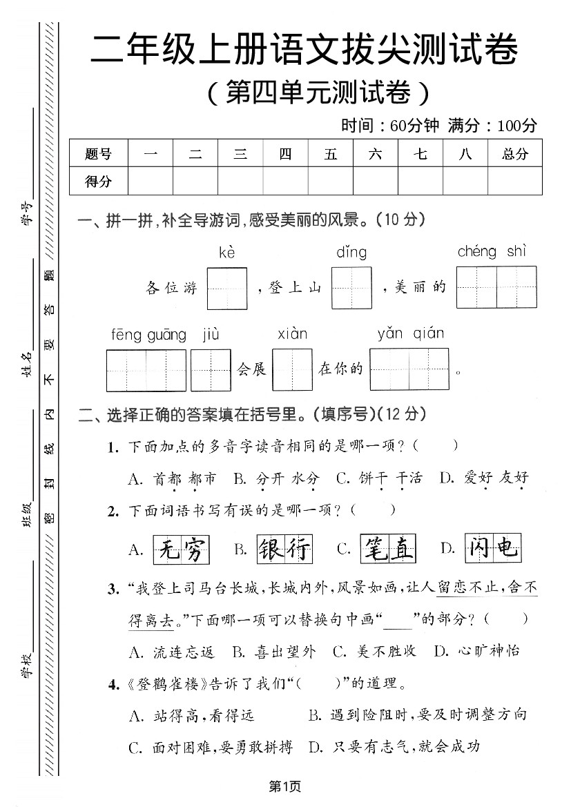 二年级(上)语文第四单元拔尖测试卷