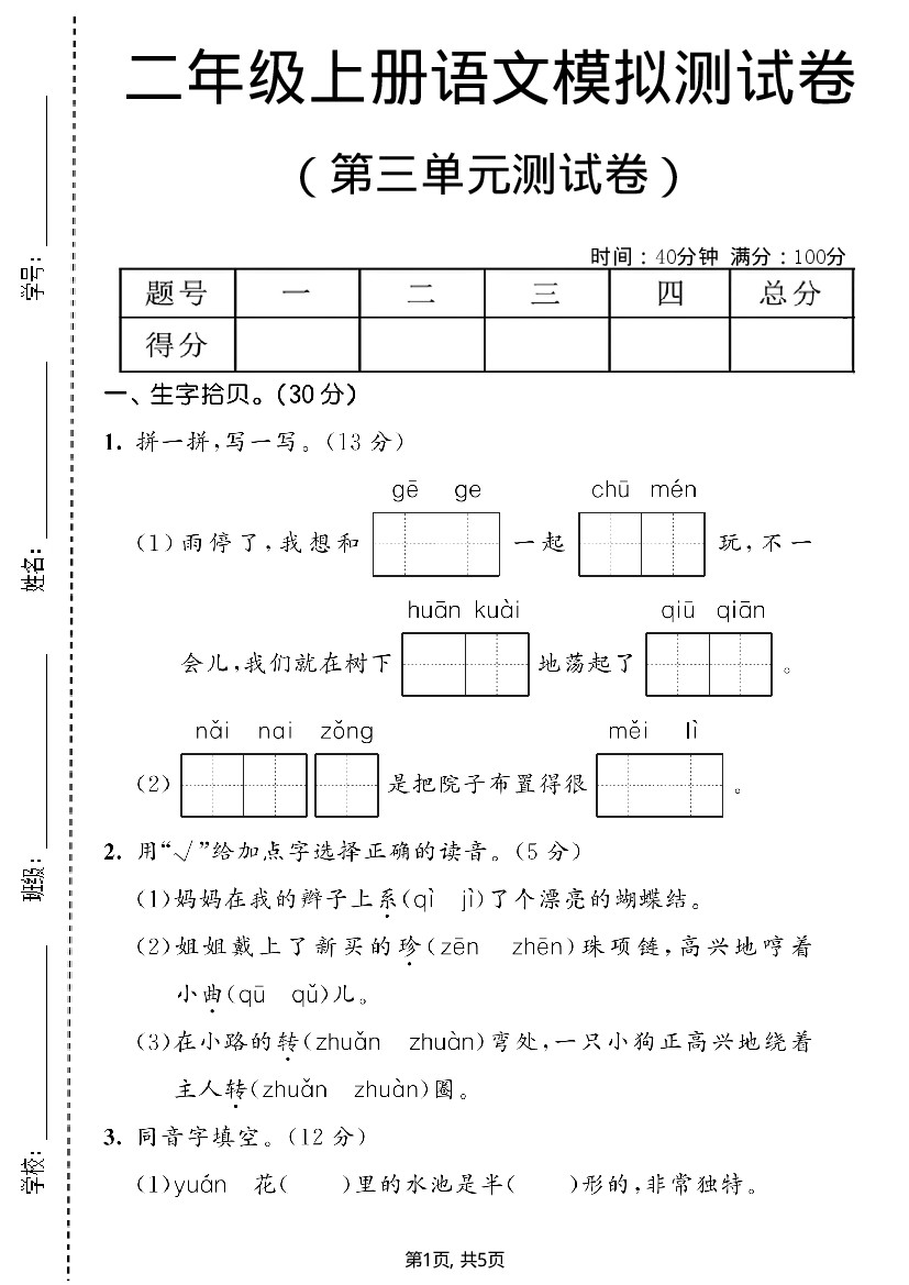 二年级(上)语文第三单元模拟测试卷