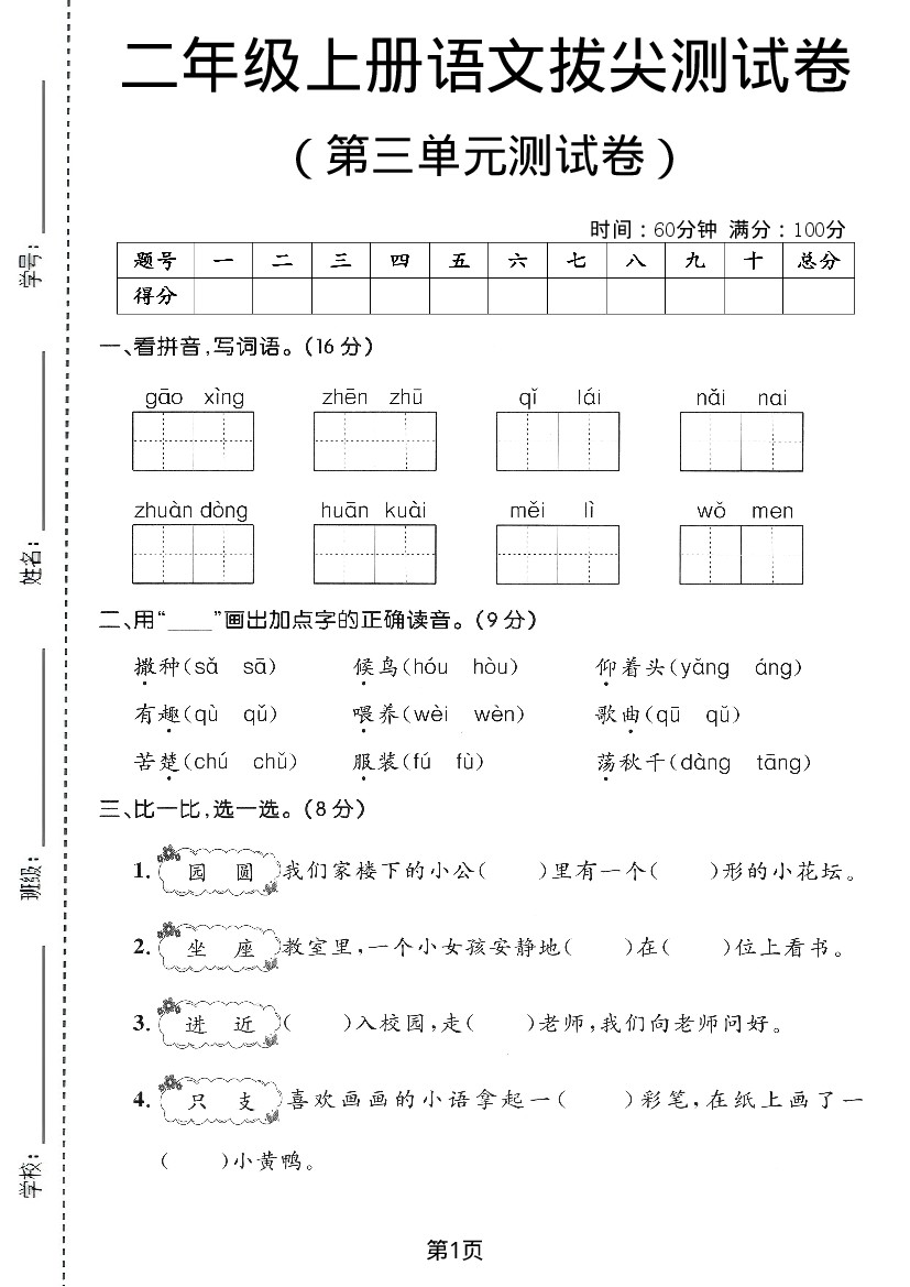 二年级(上)语文第三单元测试卷