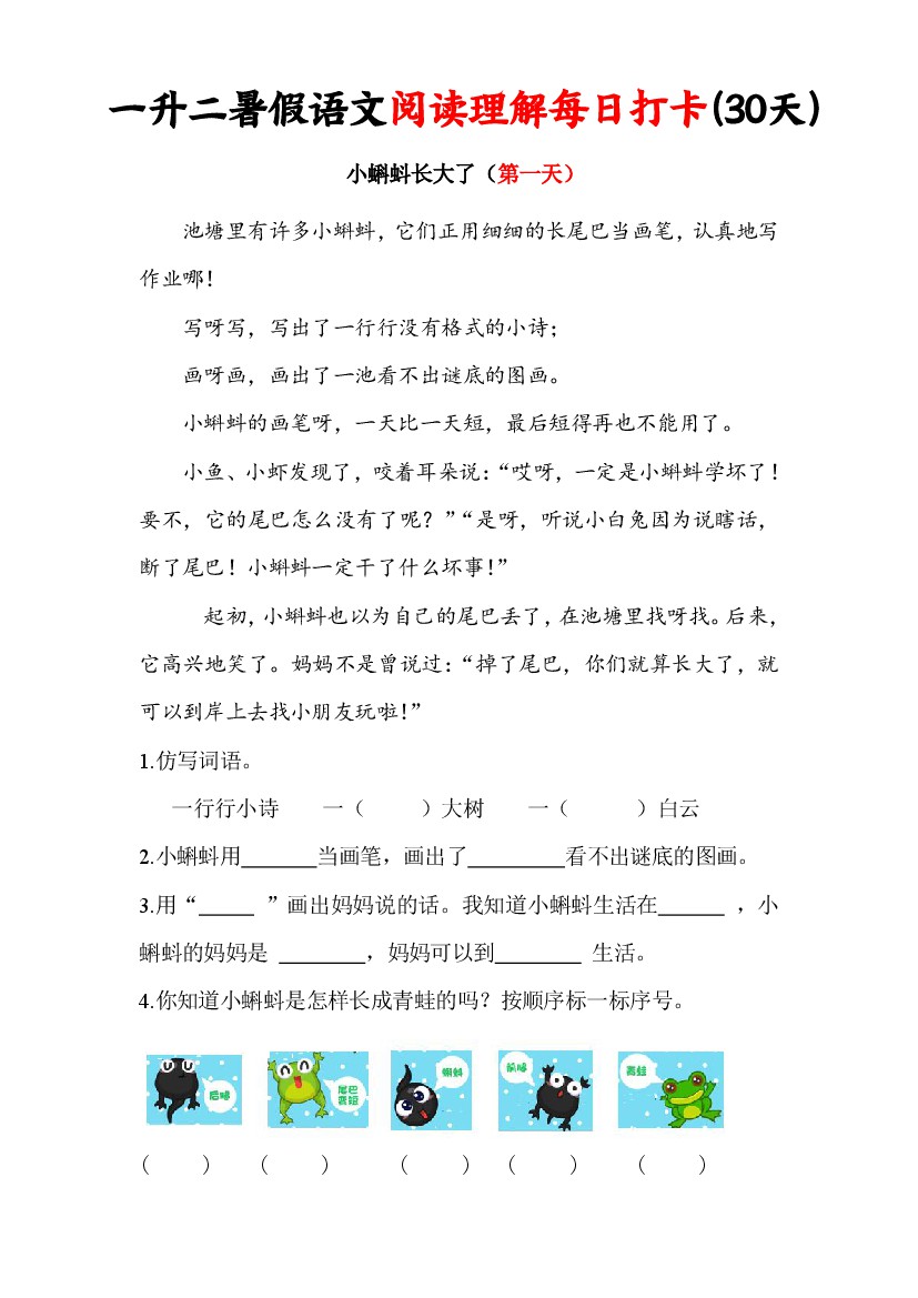 一升二暑假语文阅读理解每日打卡30天(含答案)