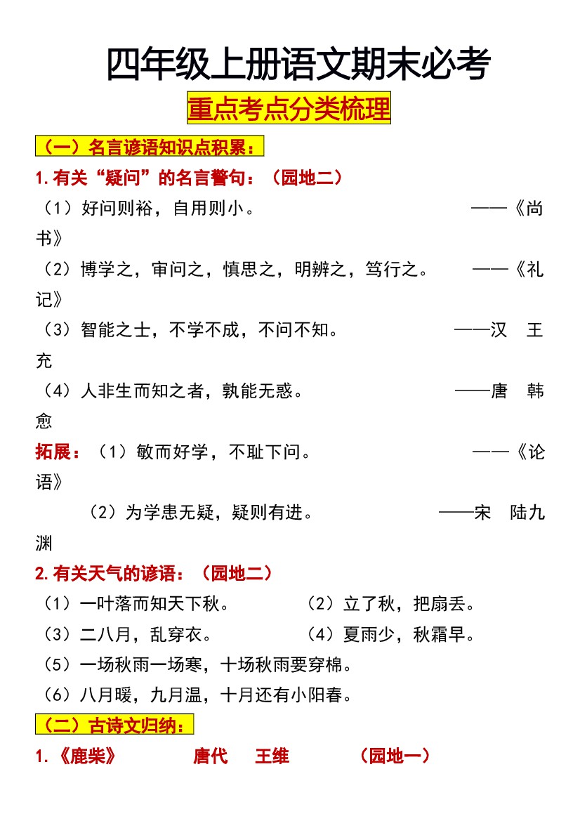【古诗谚语词语梳理】四年级上册语文必背分类梳理