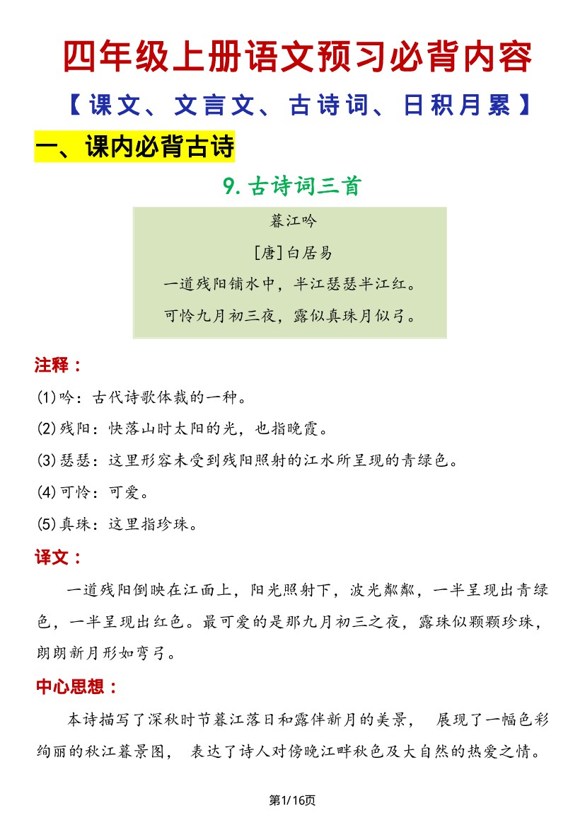 四年级上册语文积累背诵每日晨读晚默(19页)
