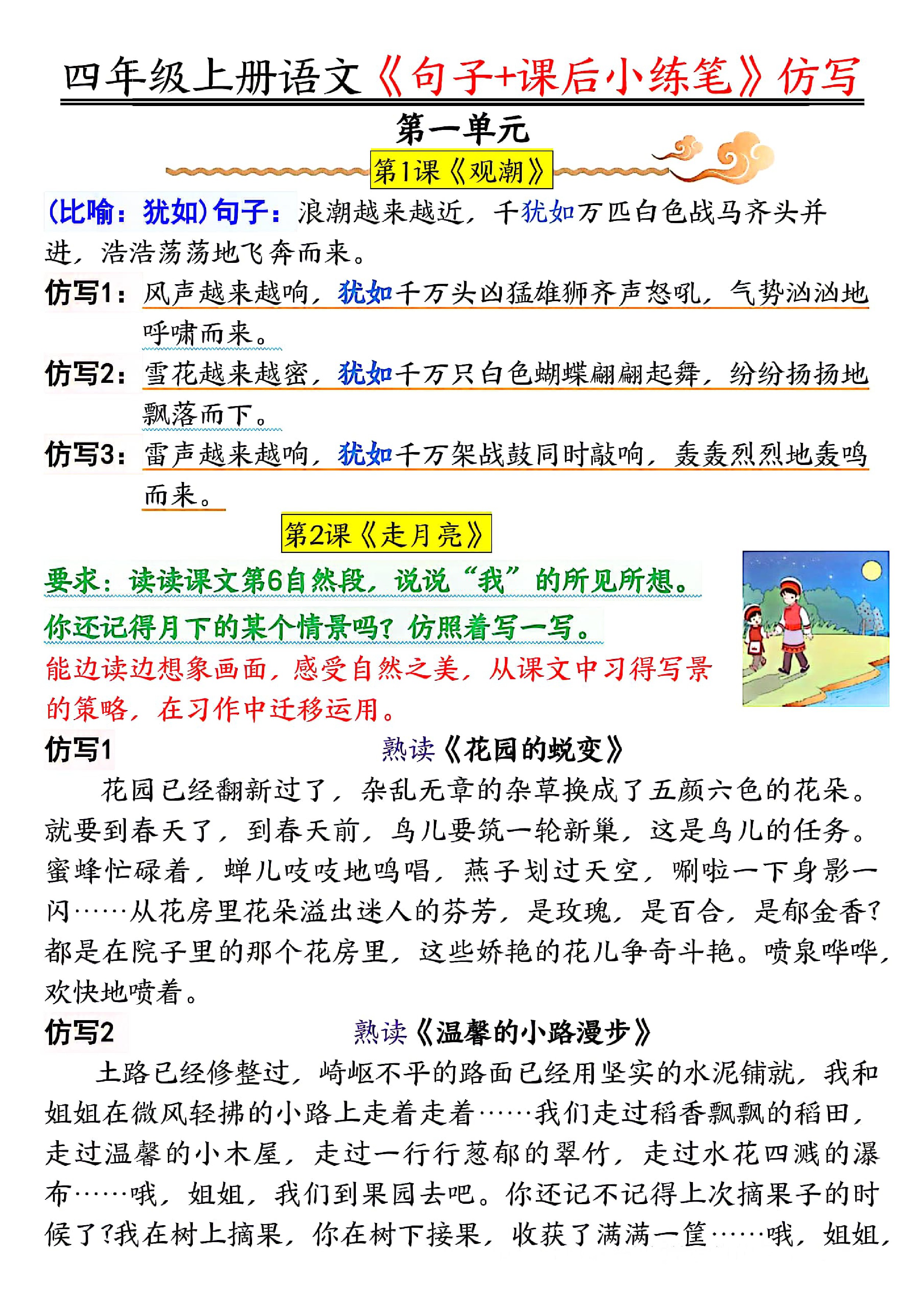 四上语文1-8单元习作写作指导及范文