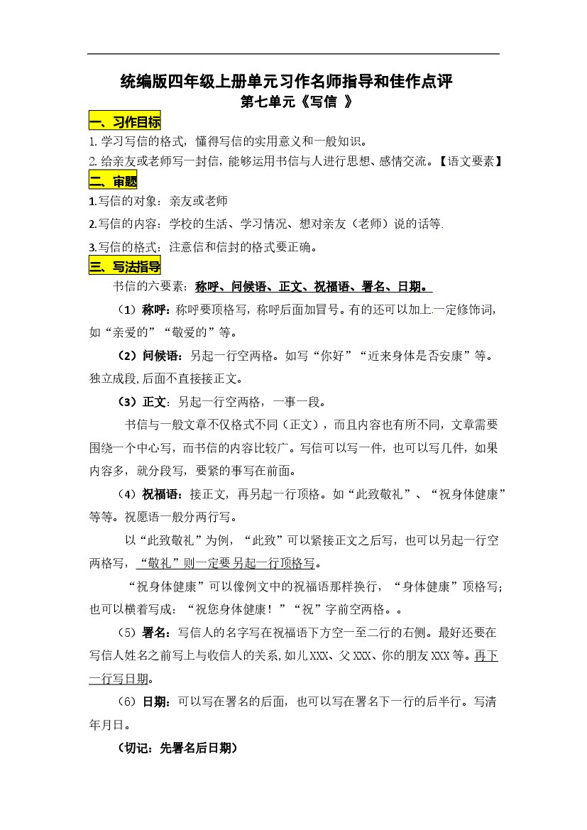 四(上)语文第七单元习作:写信