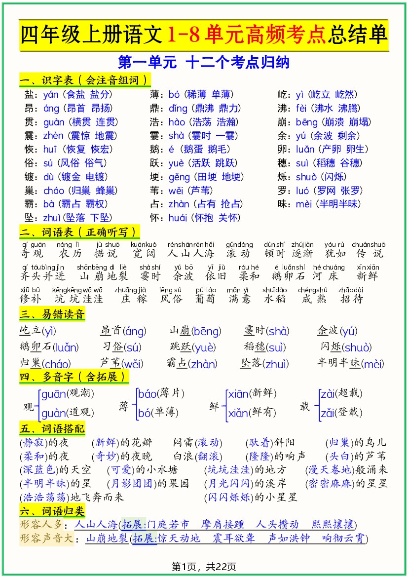 四上语文1-8单元高频考点总结单(十二个考点归纳)22页