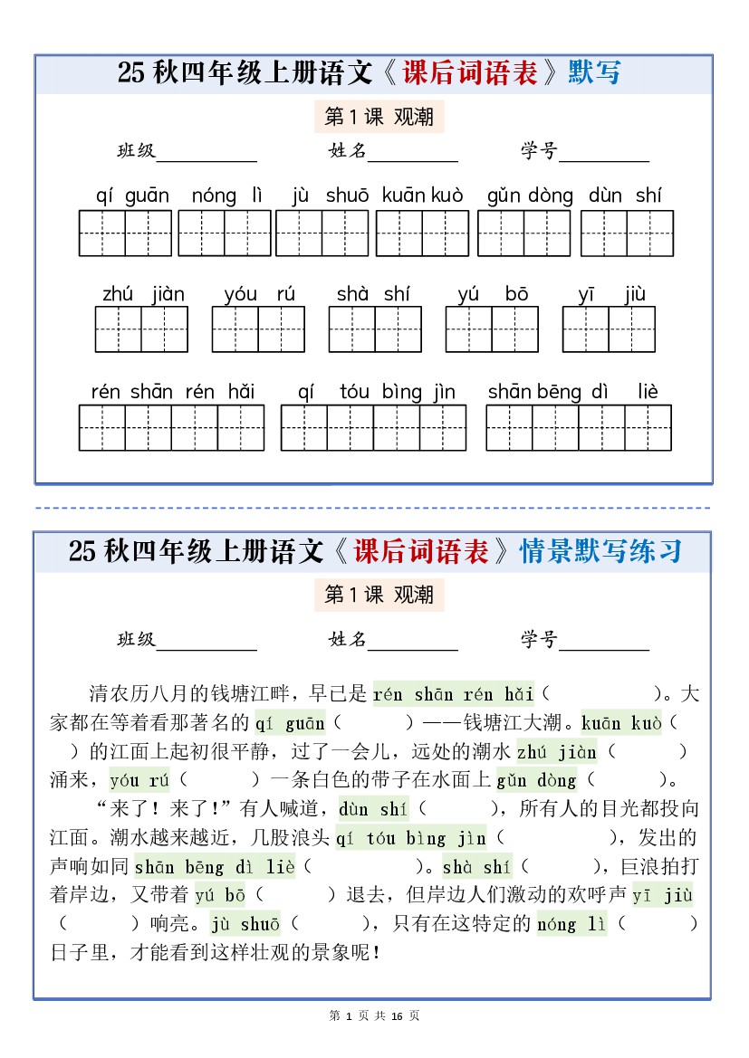 【25秋四上语文课后词语表情景式默写通关小单(含答案19页)