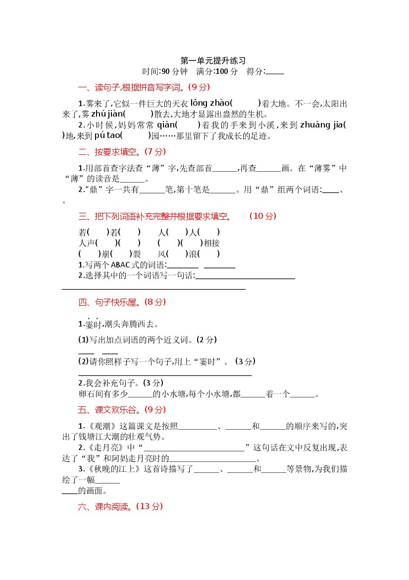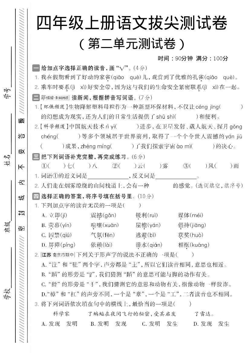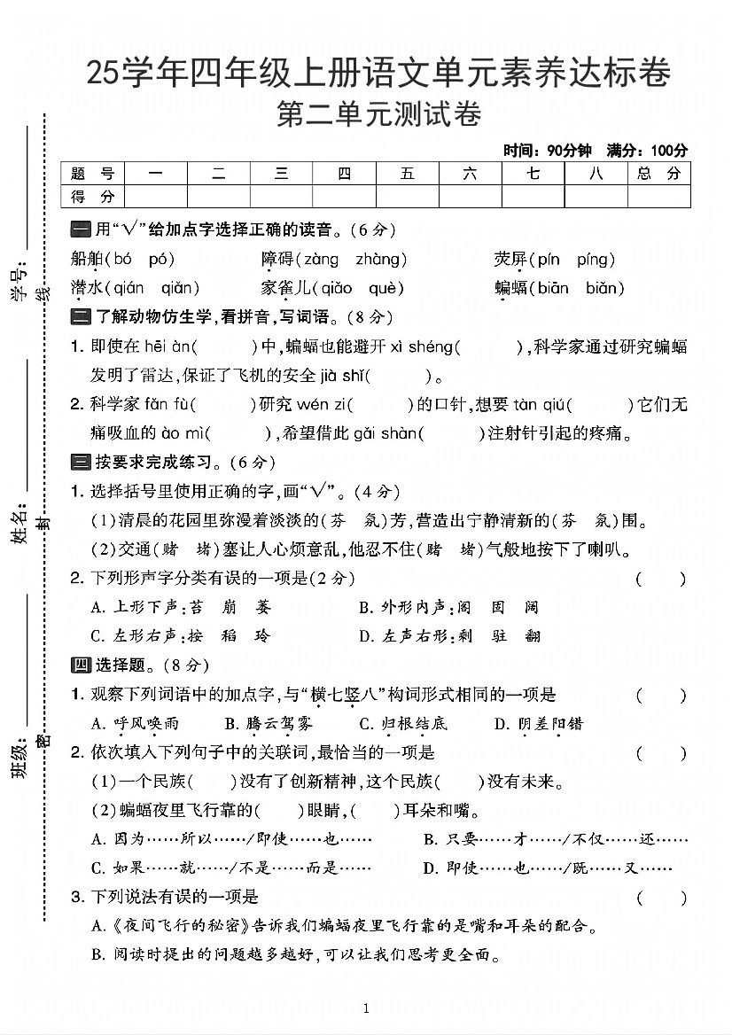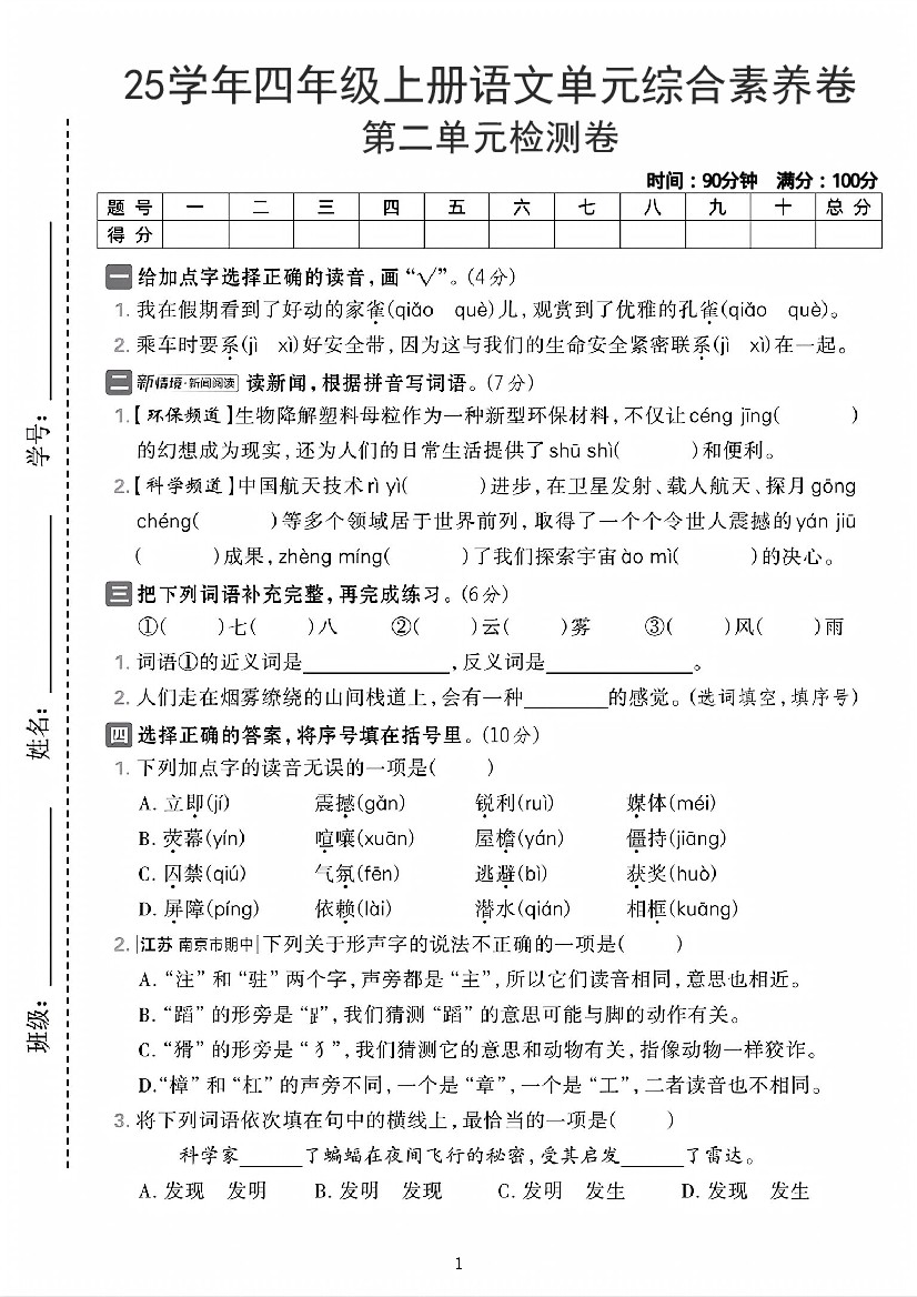 【25学年四上语文第二单元综合素养卷-家雀(含答案7页)