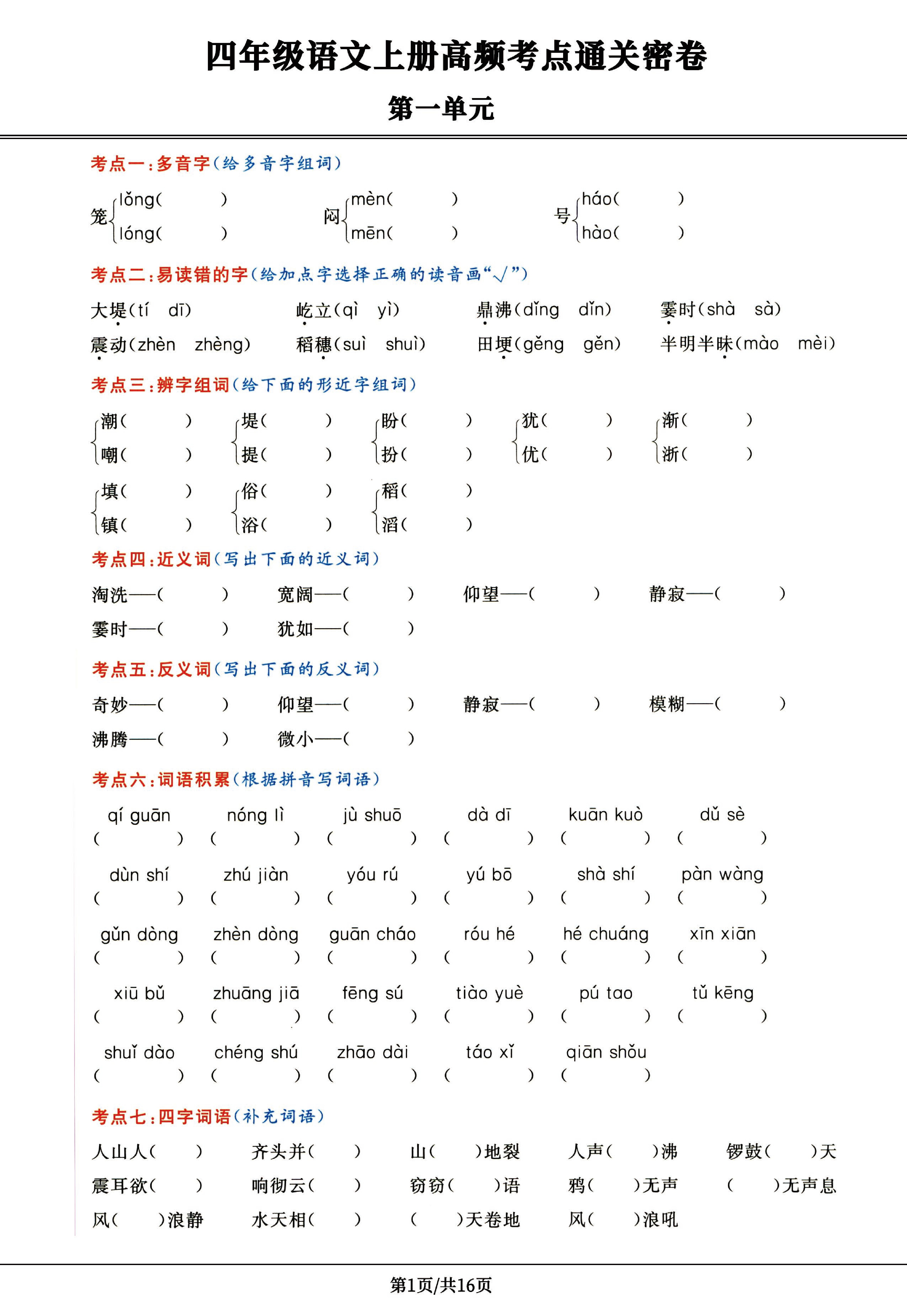 【语文】四上高频考点密卷,16页每一道题都务必掌握到位!