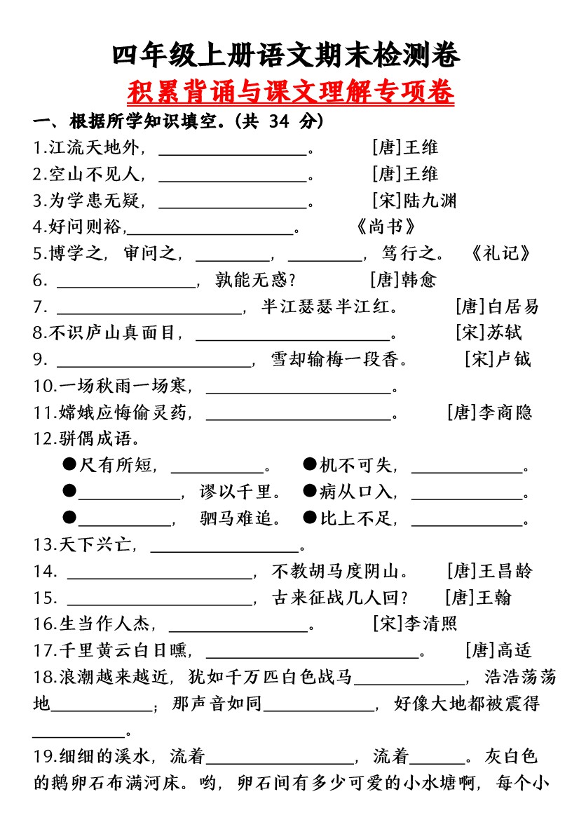 【期末积累背诵与课文理解专项卷(附答案)】四上语文