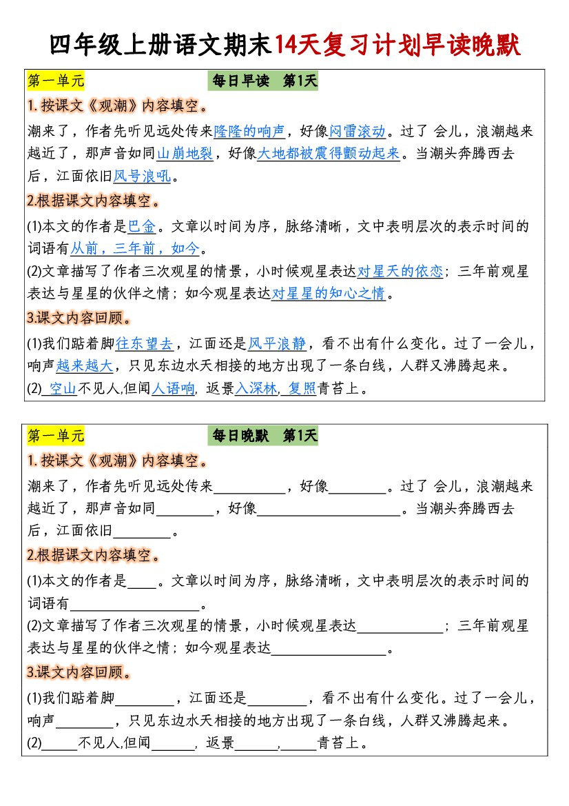 【按课文内容填空】统编版四年级上册语文期末按课文内容填空专题训练(含答案)