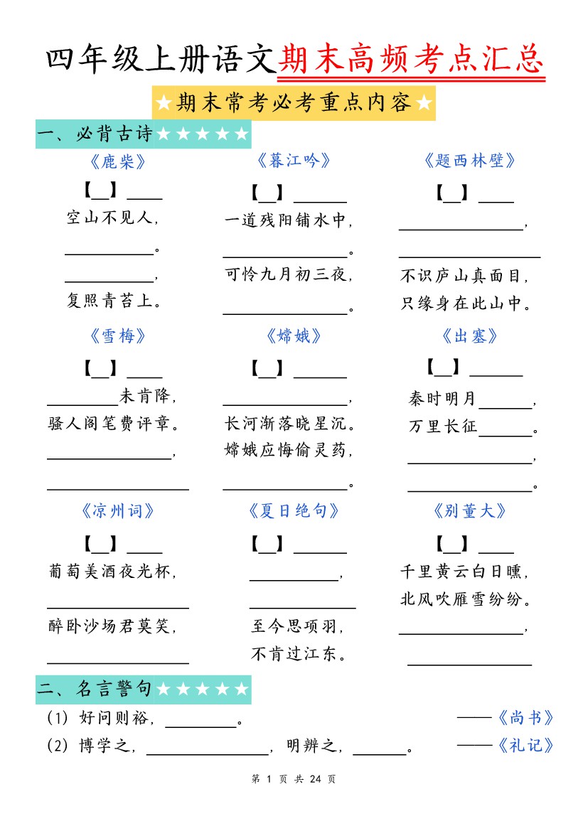 【期末复习1-8单元古诗、名言、日积月累综合练习】四上语文