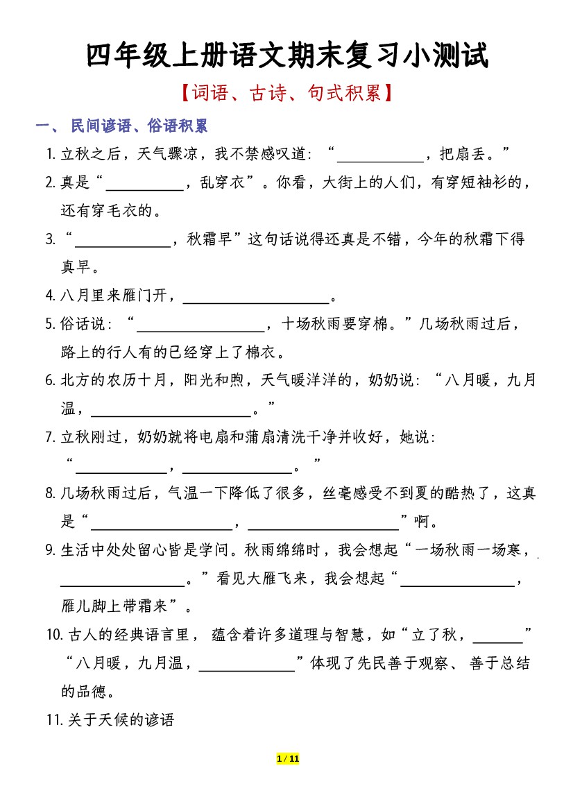 【2025秋新版】四年级上册语文期末复习必背日积月累填空练习