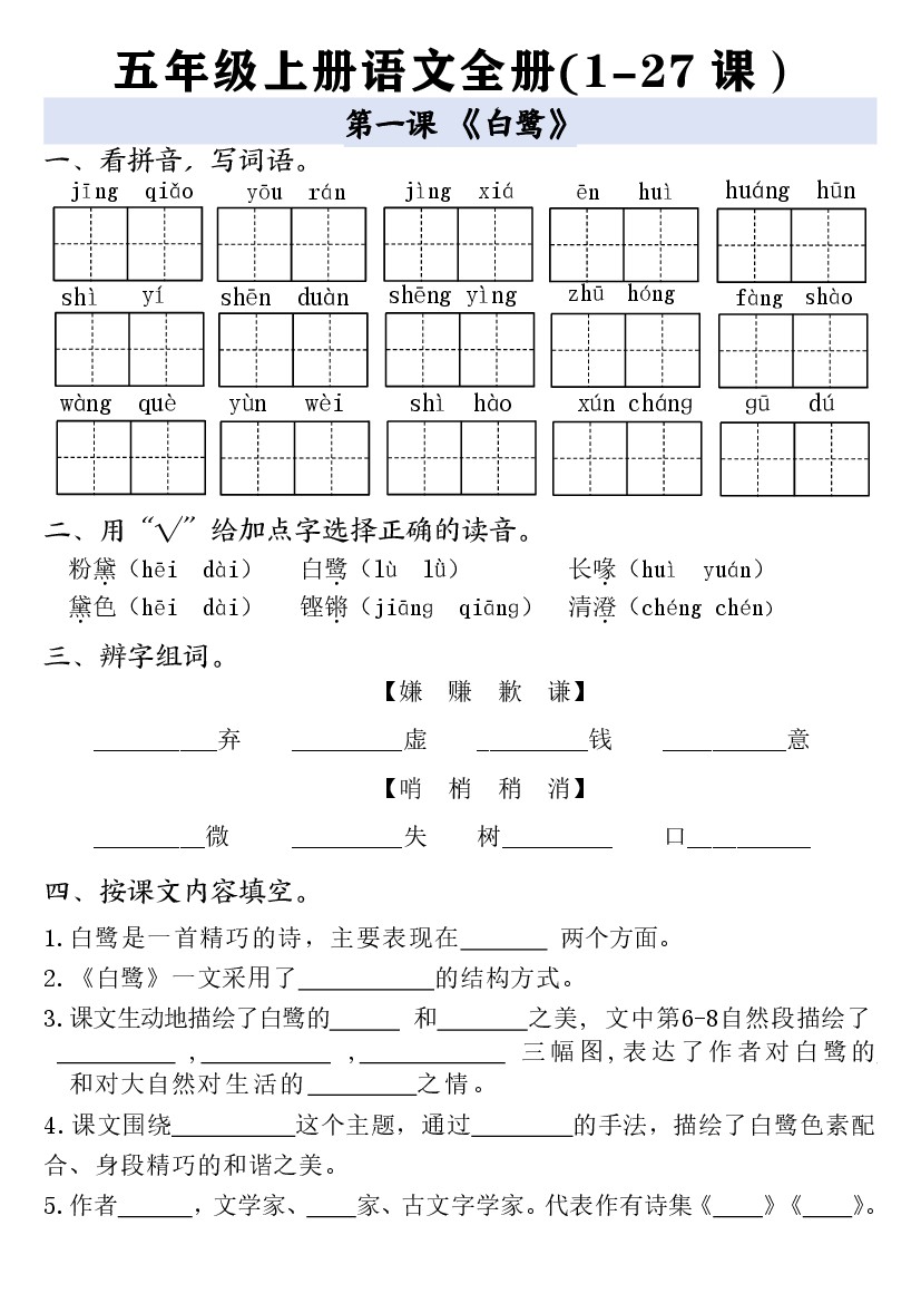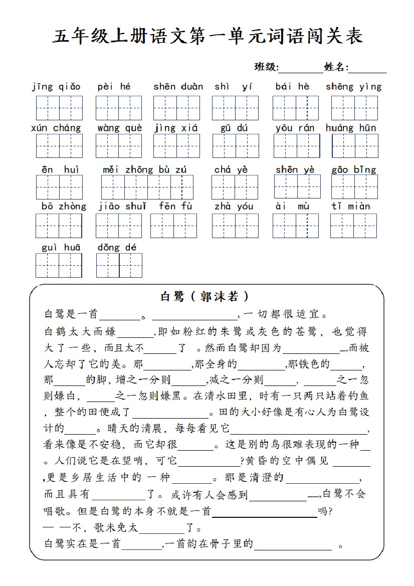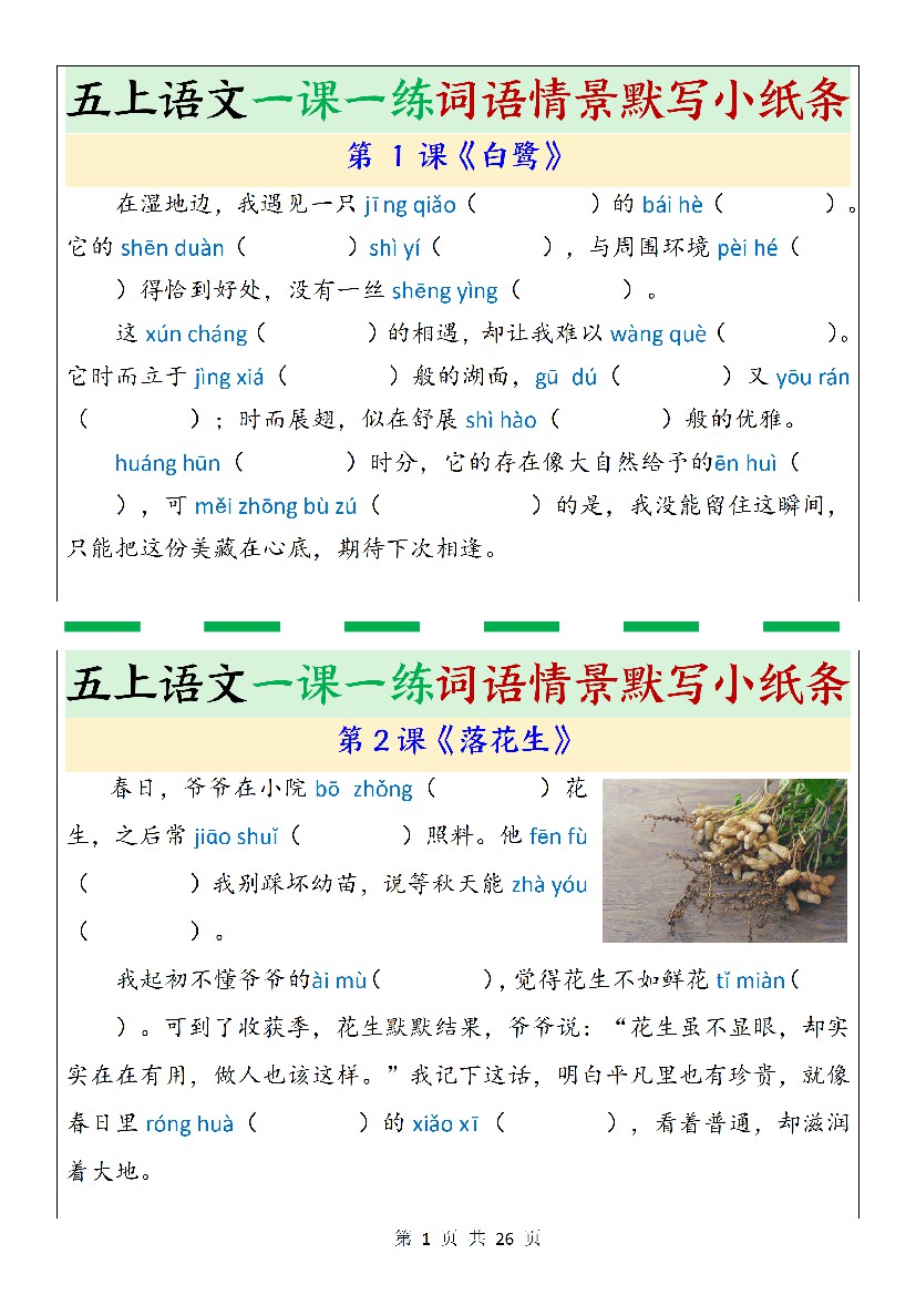 五上语文 一课一练词语情景默写小纸条(含答案26页)