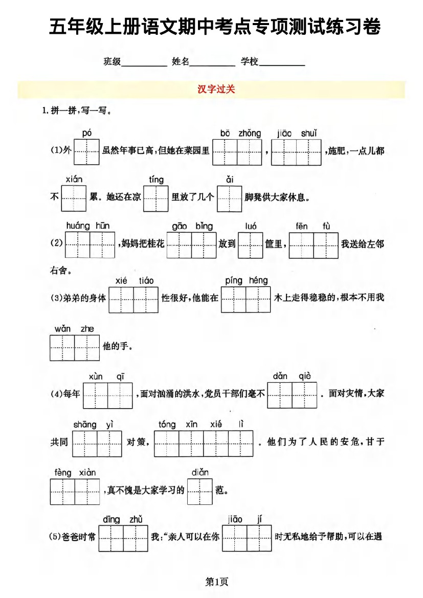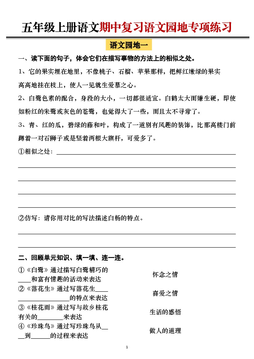 五年级上册语文期中冲刺专项复习(答案+空白)