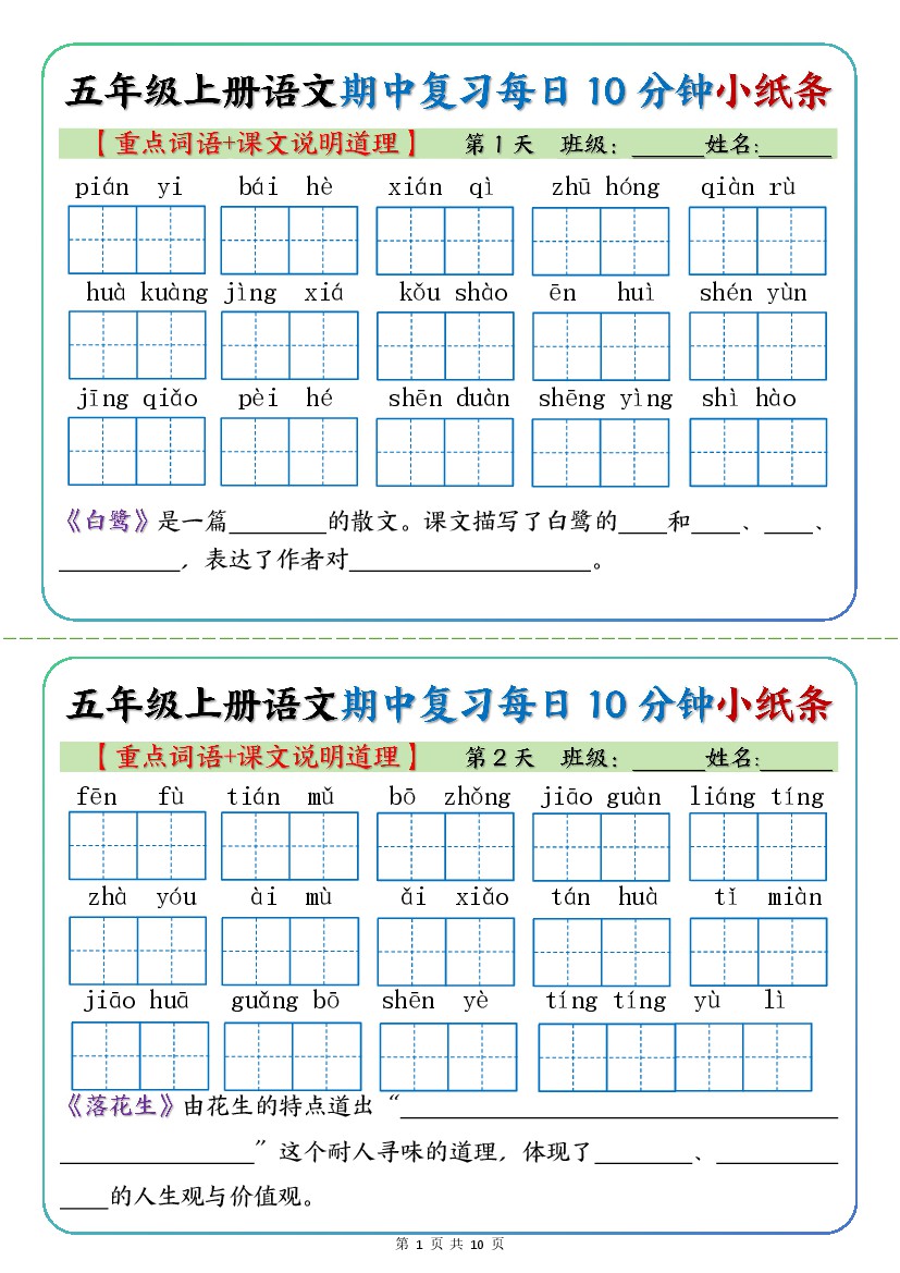 五年级上册语文期中复习小纸条【重点字词+课文说明道理】