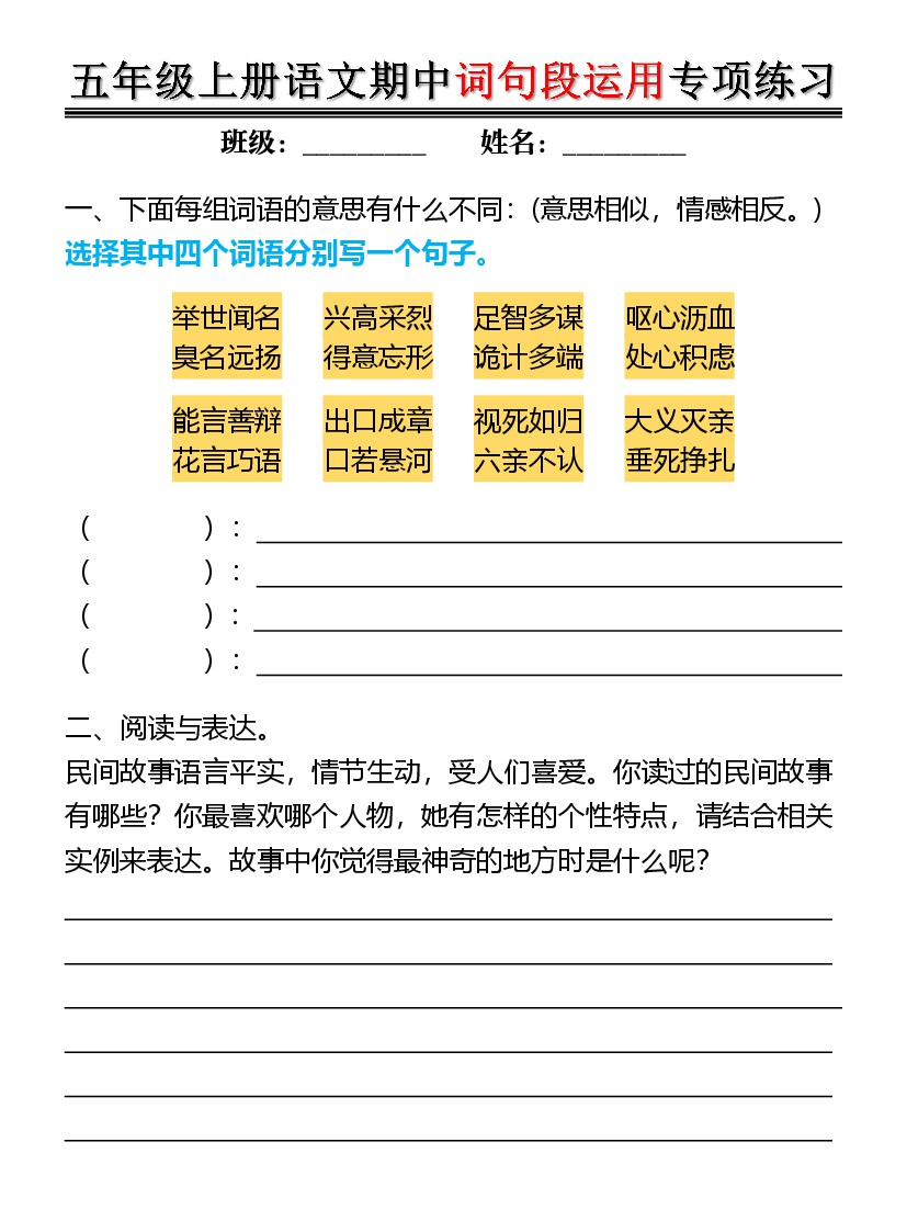 【语文】五年级期中语文句子与语言运用专练