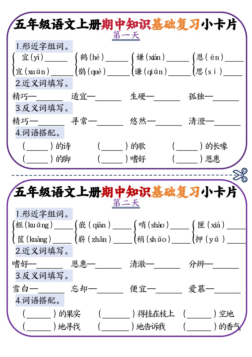 五年级语文上册期中知识点复习小卡片