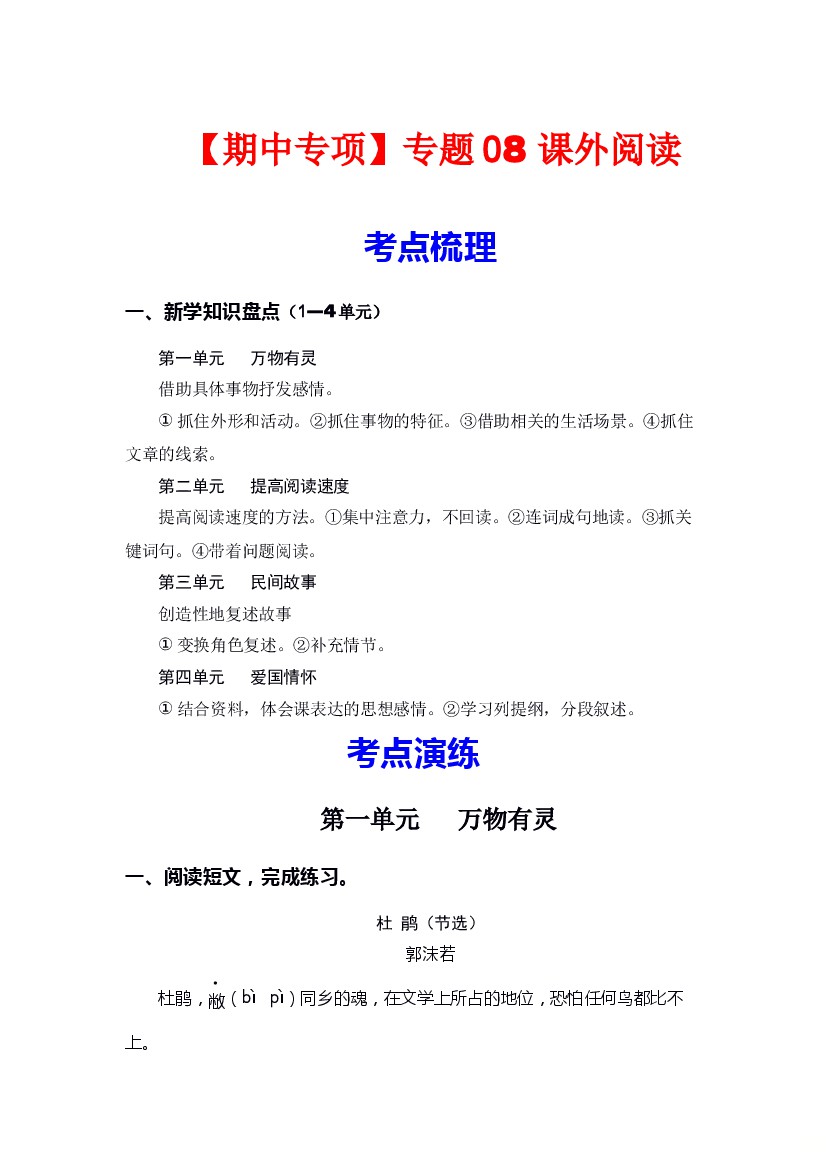 专题 08课外阅读(1—4单元每个单元三到四篇)(考点+试题)-2023-2024学年五年级语文上册期中专项复习(统编版)