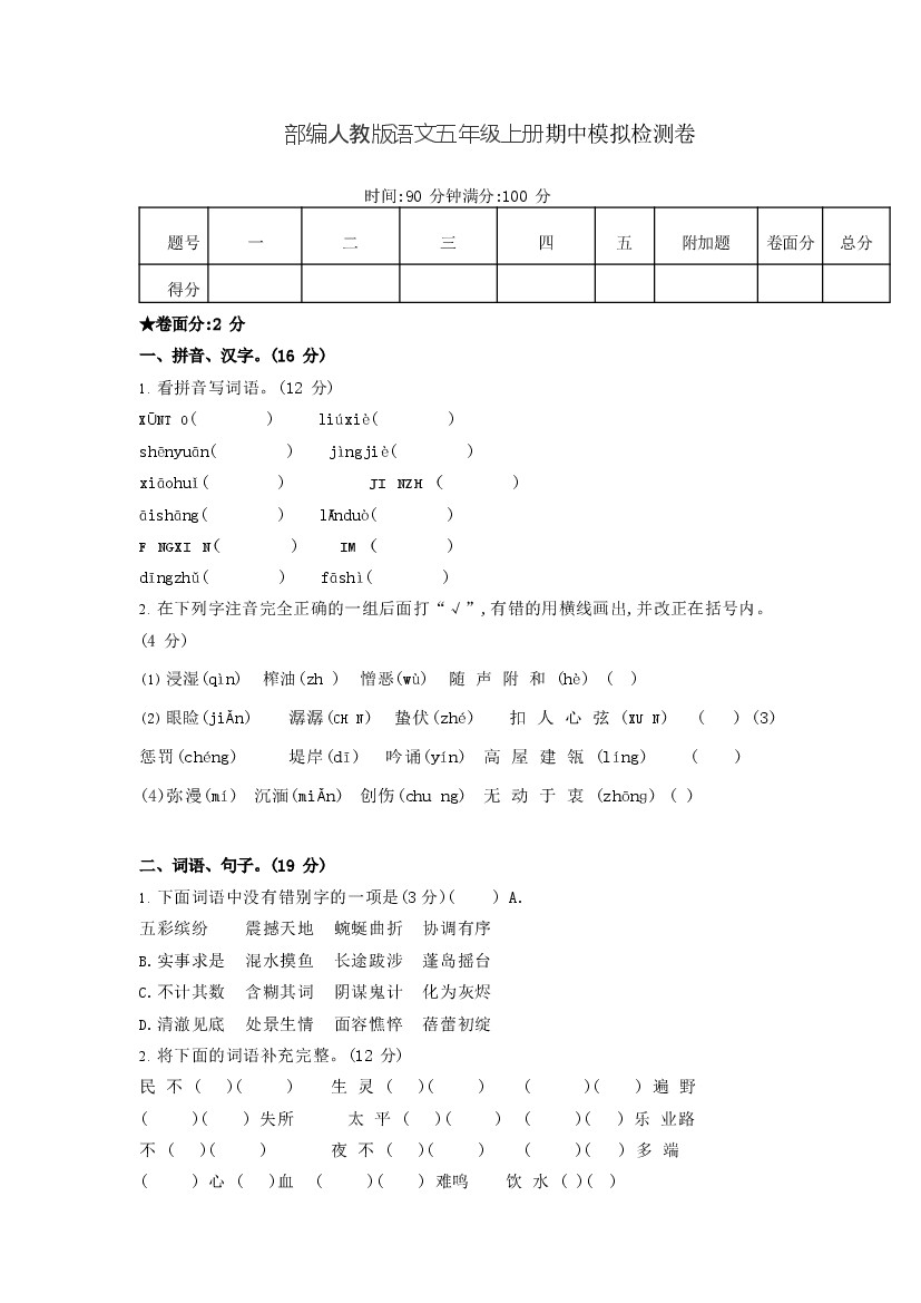 五(上)语文期中真题检测卷_2