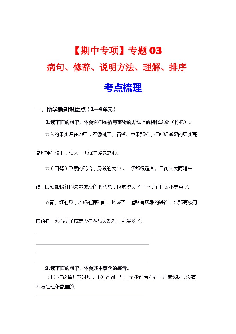 专题 03病句、修辞、说明方法、理解、排序(考点+试题)-2023-2024学年五年级语文上册期中专项复习(统编版)