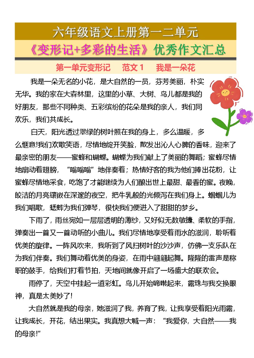 六年级语文上册第一二单元《变形记+多彩的生活》优秀作文汇总