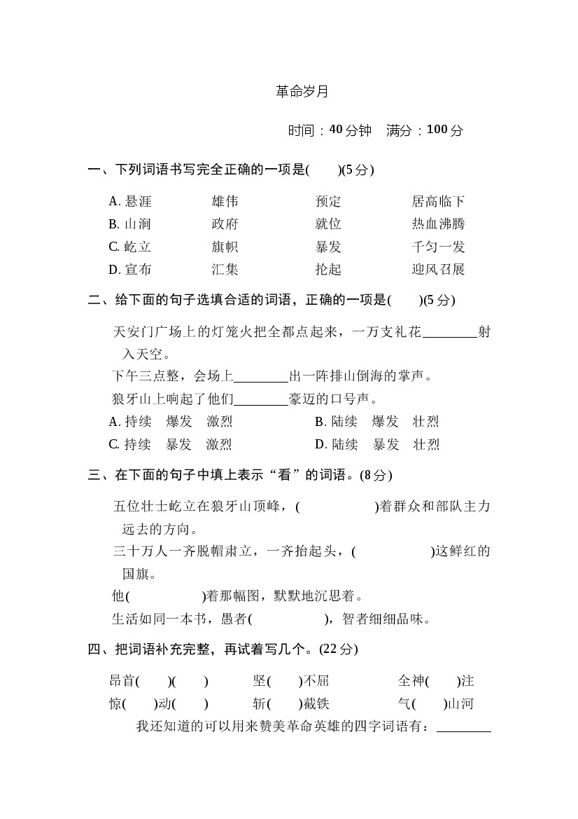 25年秋六上语文 “革命岁月”主题突破卷