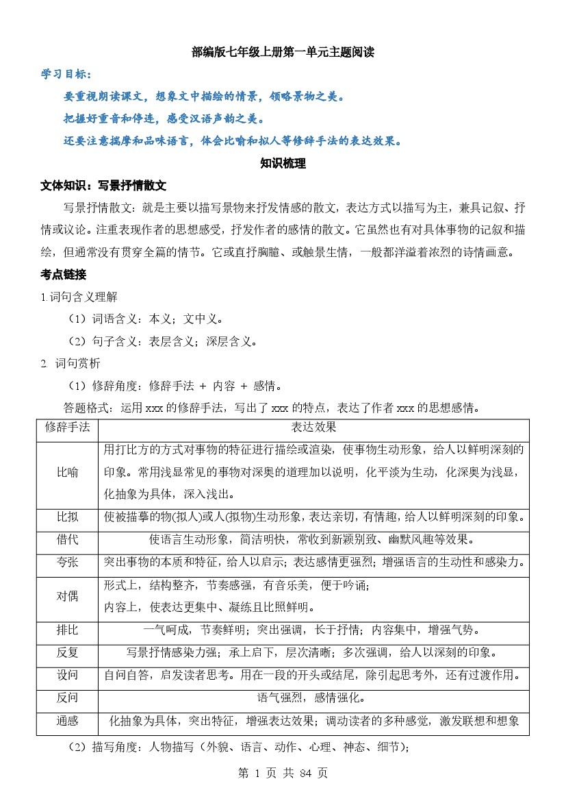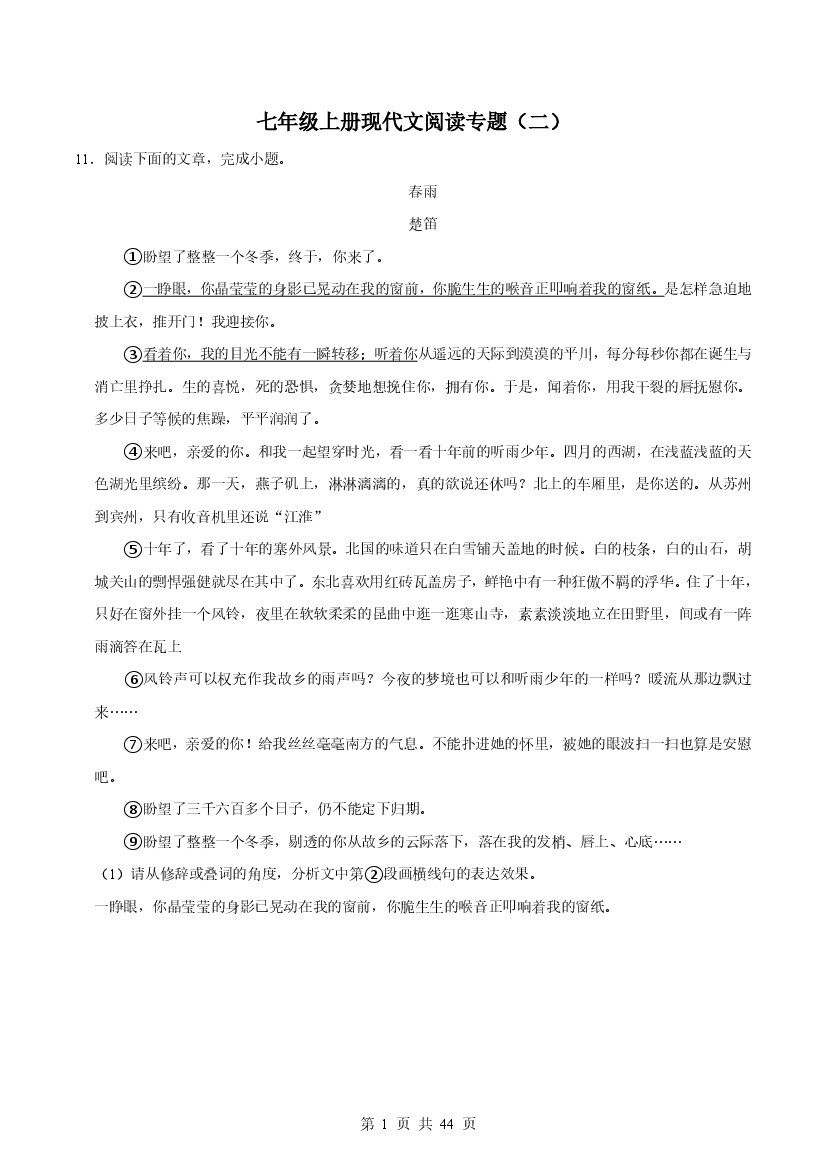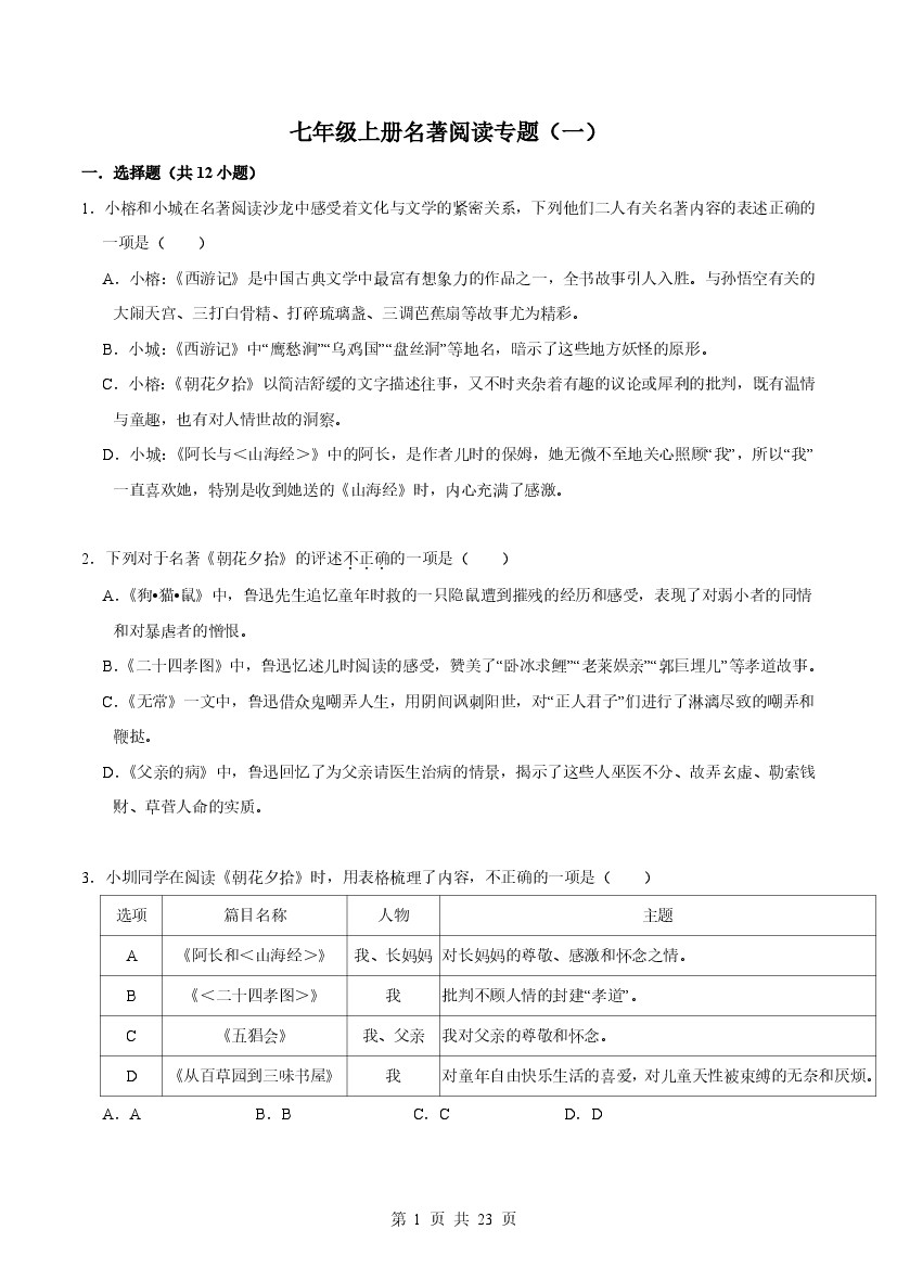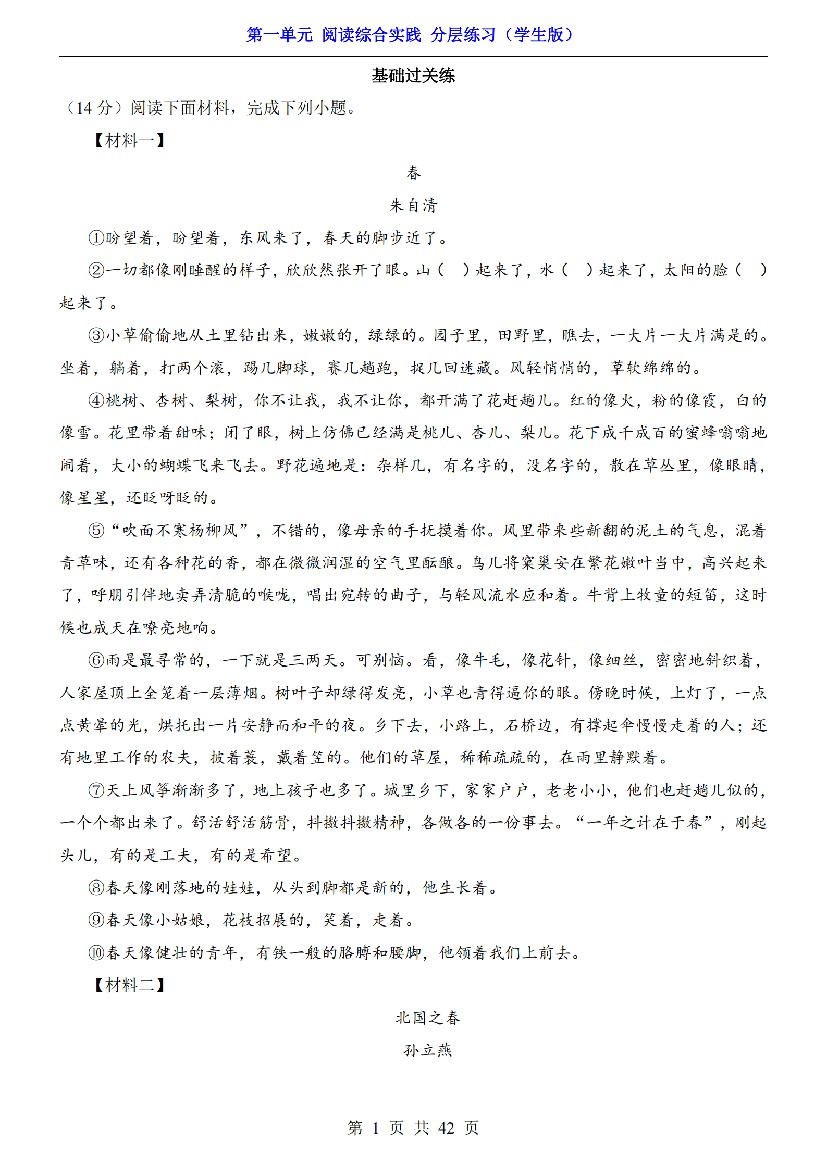 七年级(上)语文第一单元 阅读综合实践 分层练习