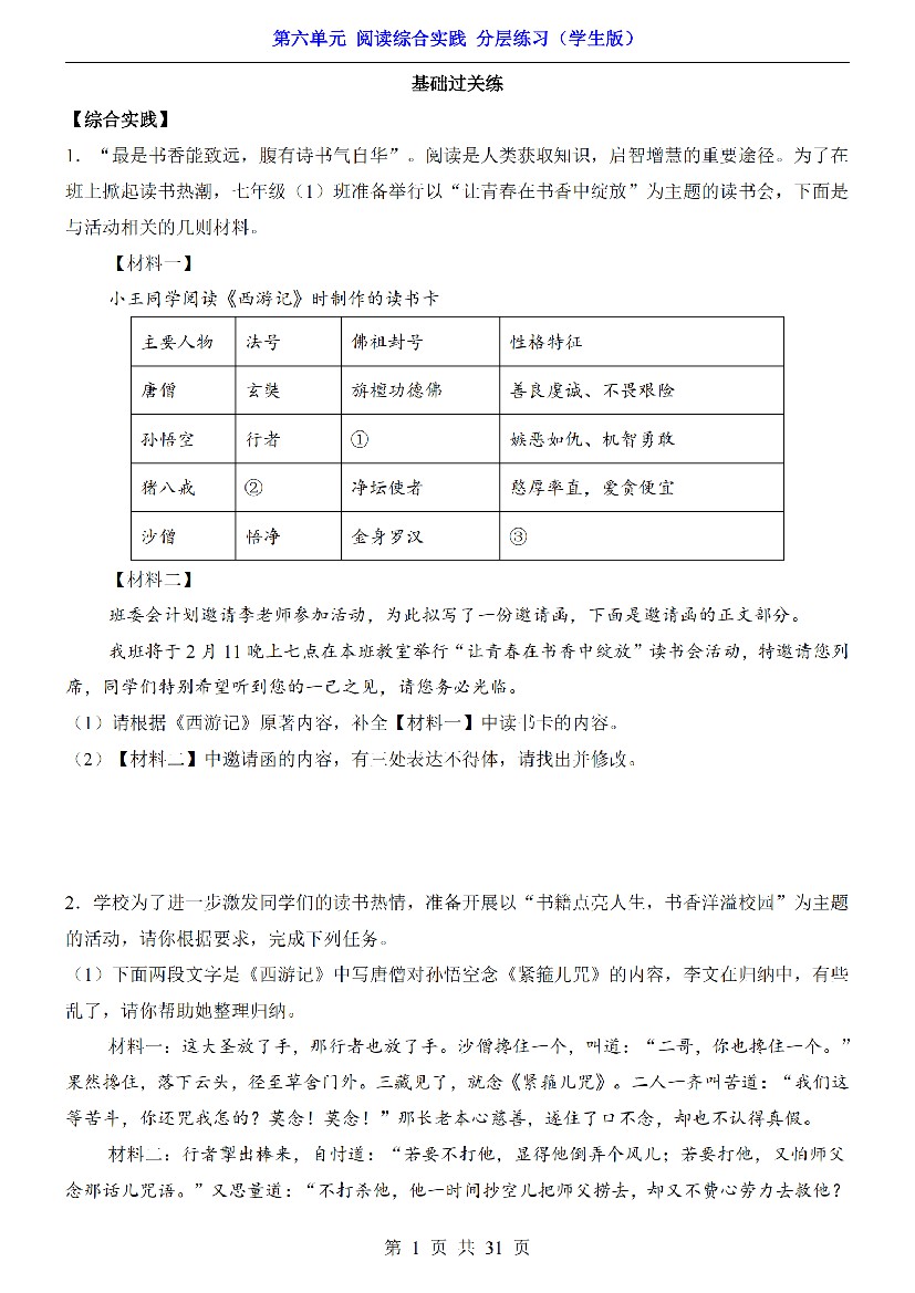 七年级(上)语文第六单元 整本书阅读 西游记 分层练习