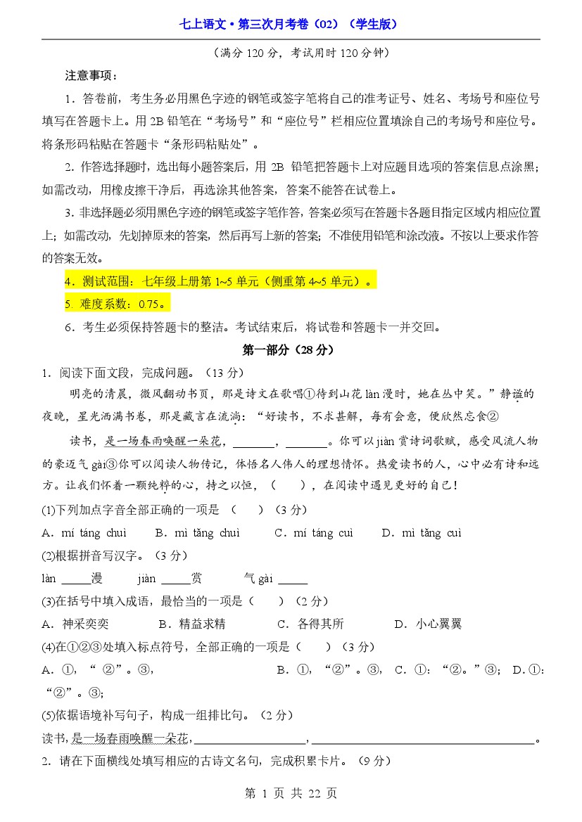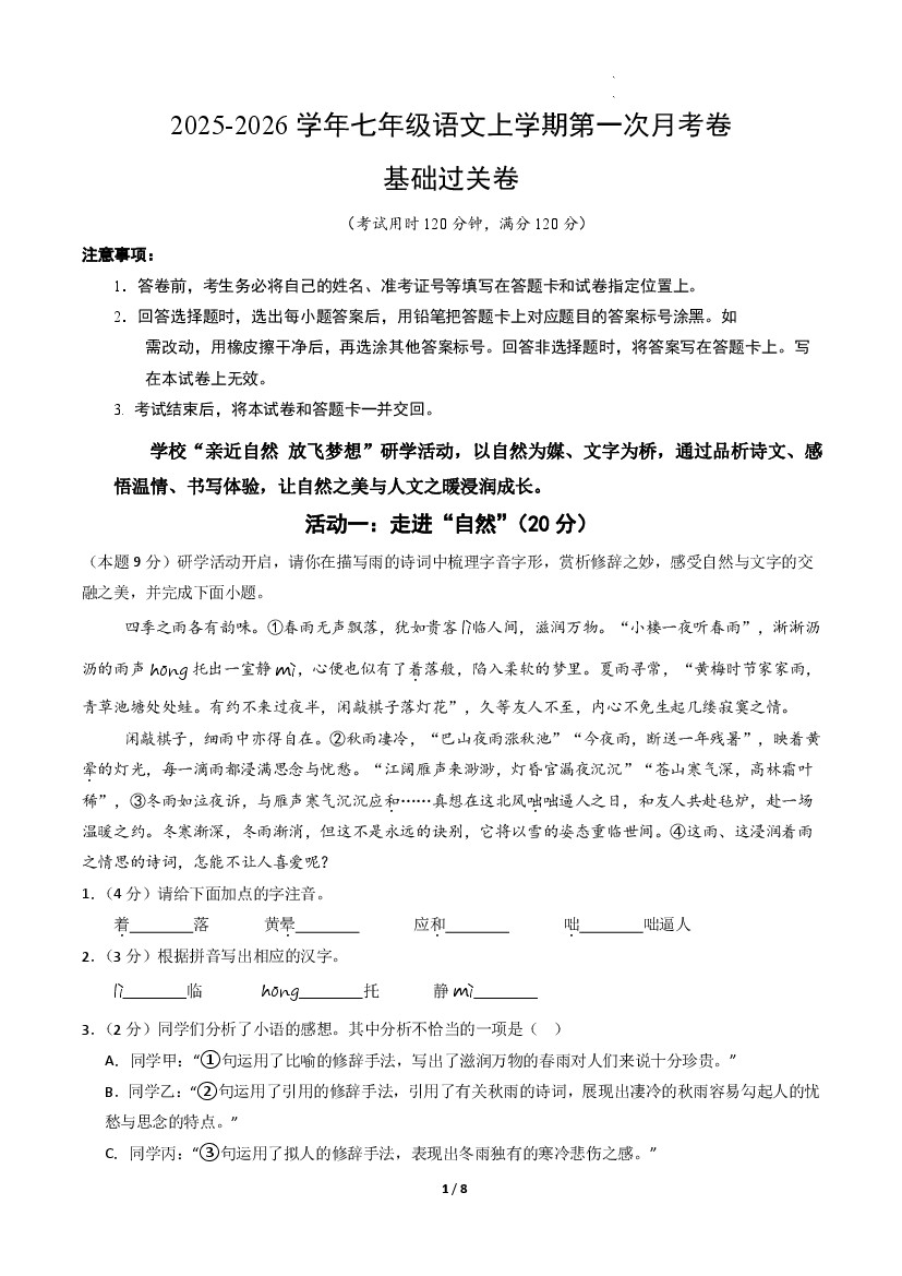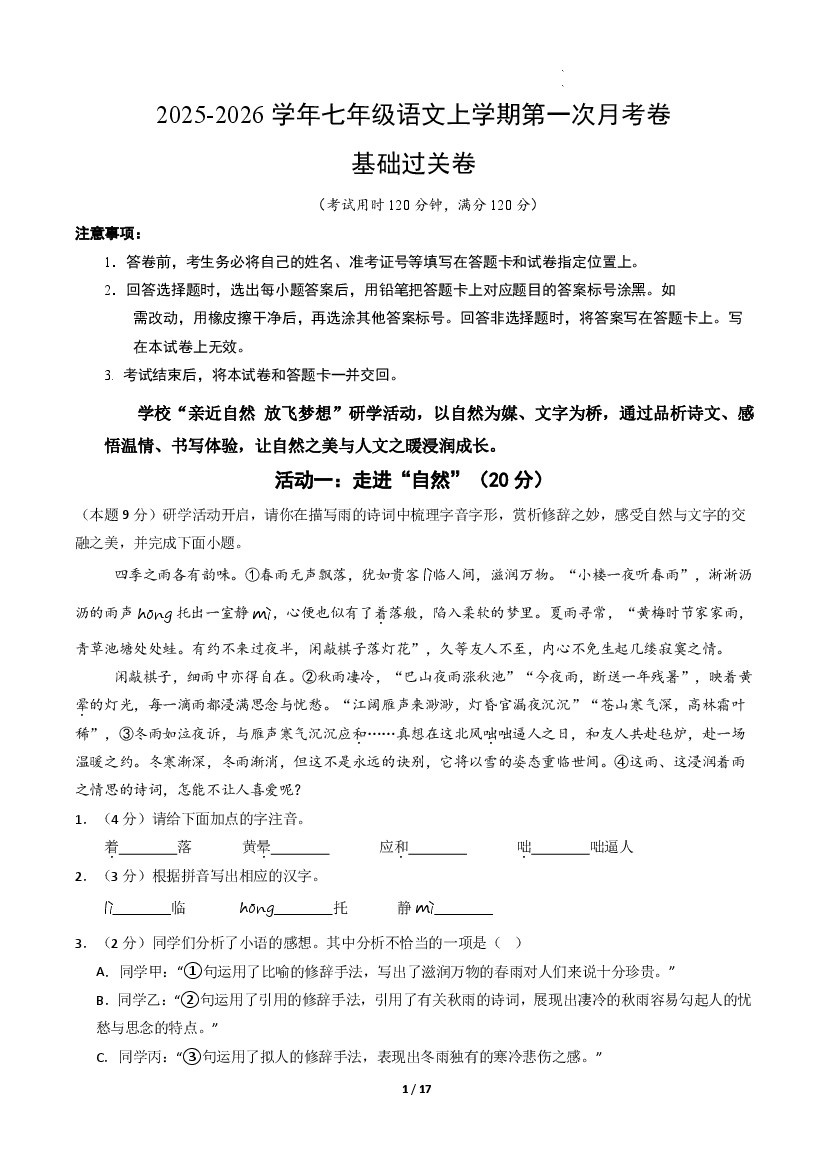 七年级语文第一次月考卷·基础过关卷(考试版A4)